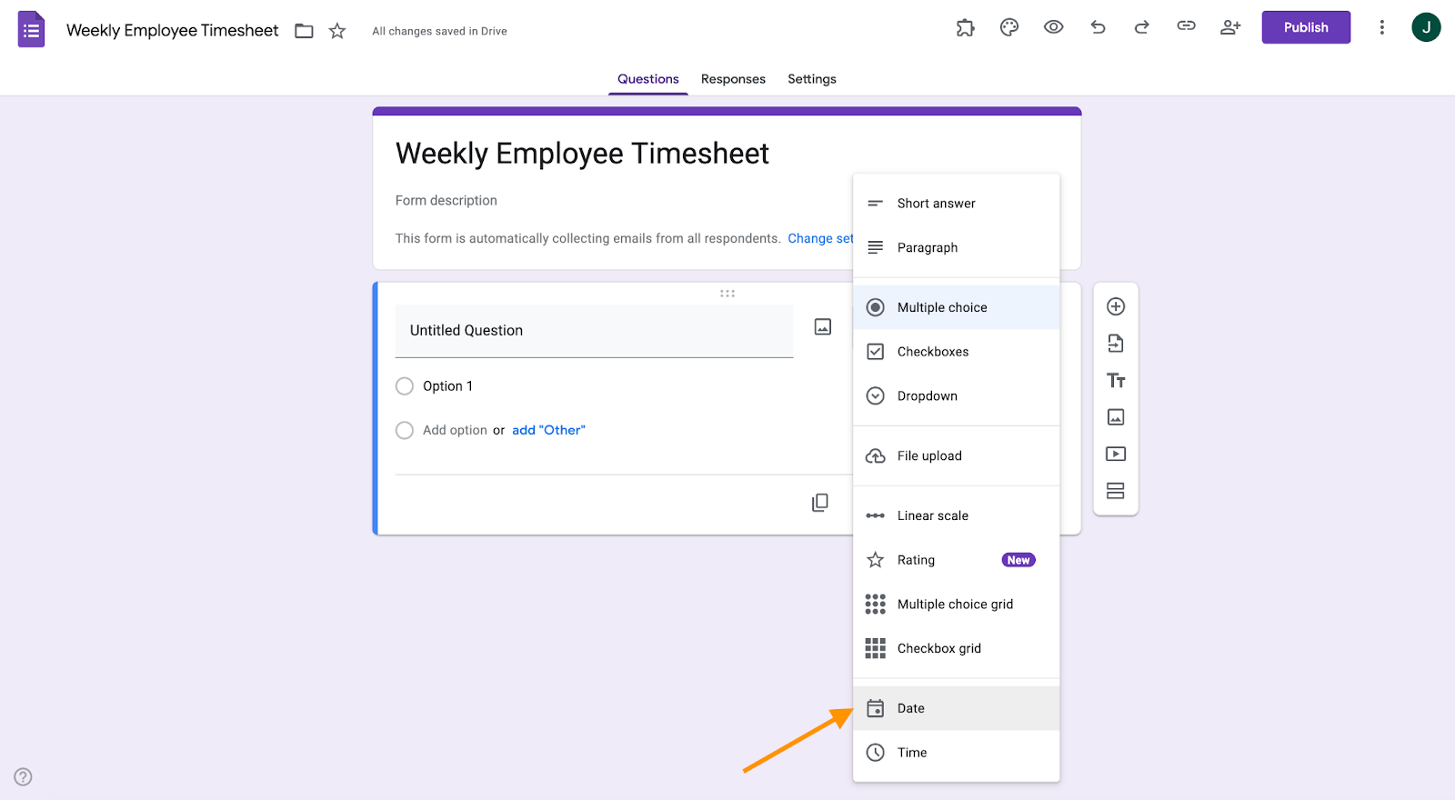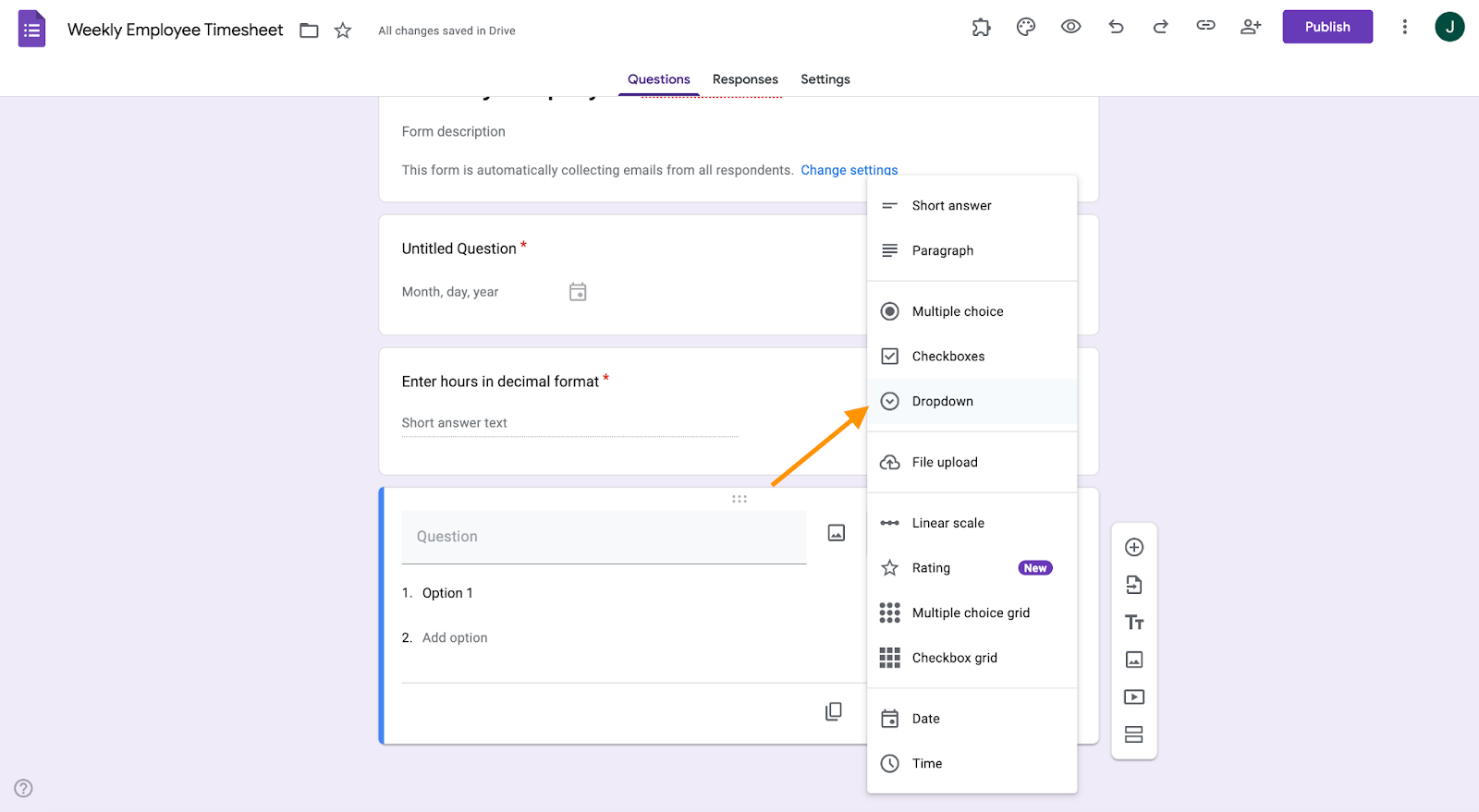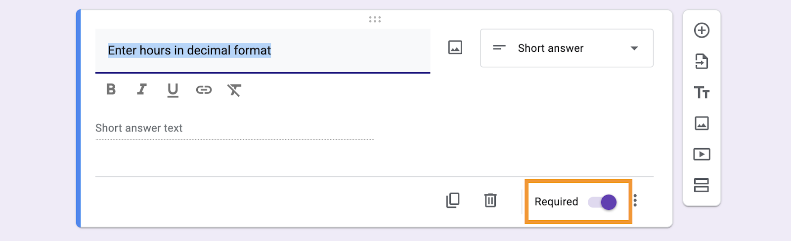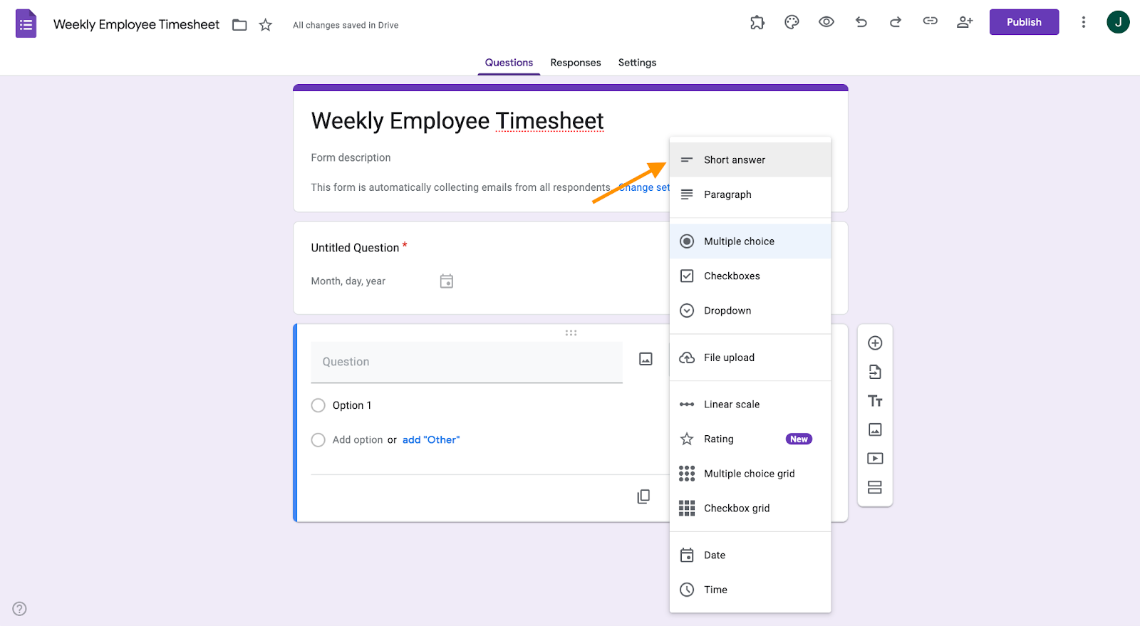 - Short answer: Use “Short answer” for employees to input hours worked. You might have separate fields for regular hours, overtime, or breaks.