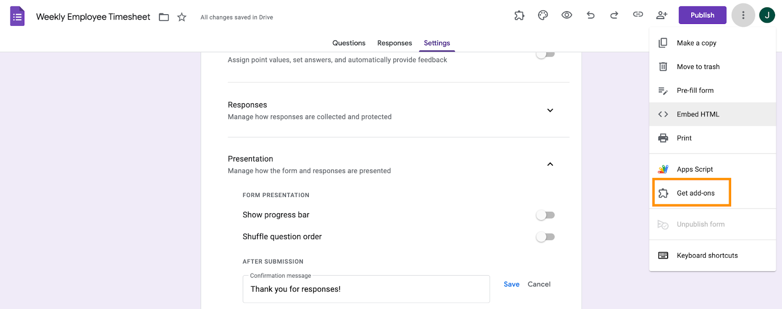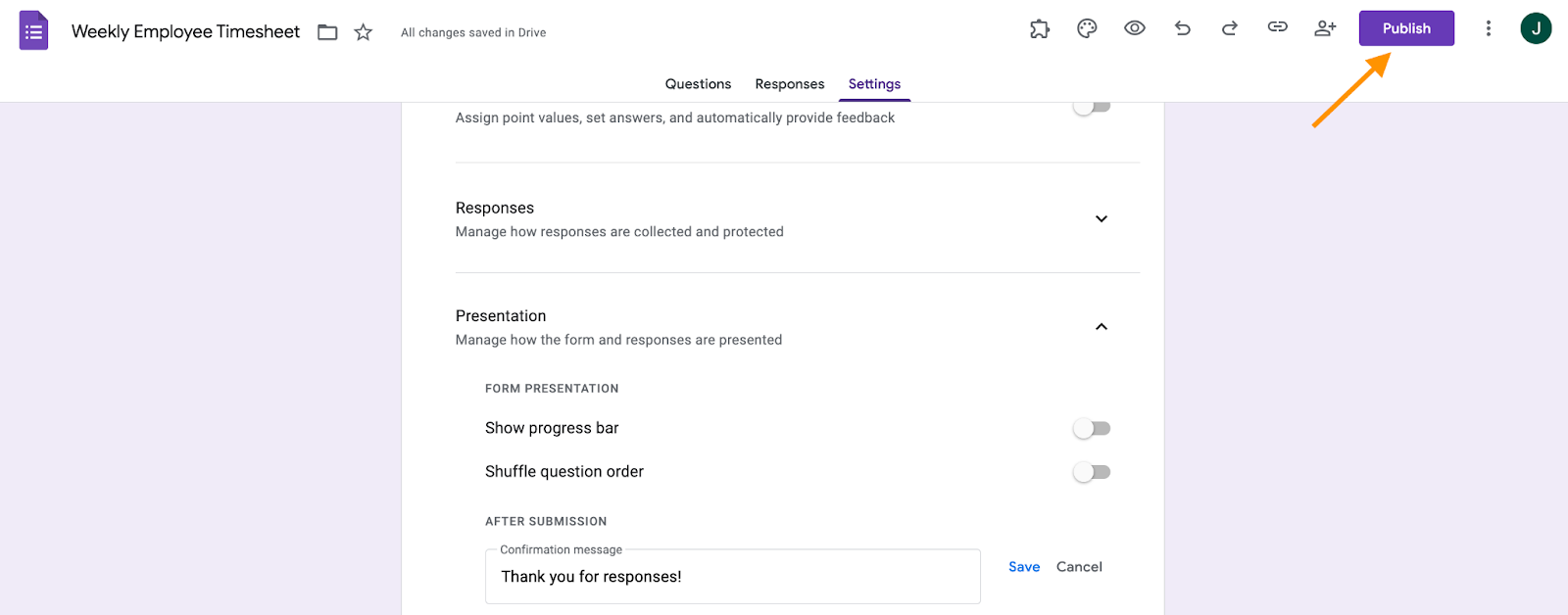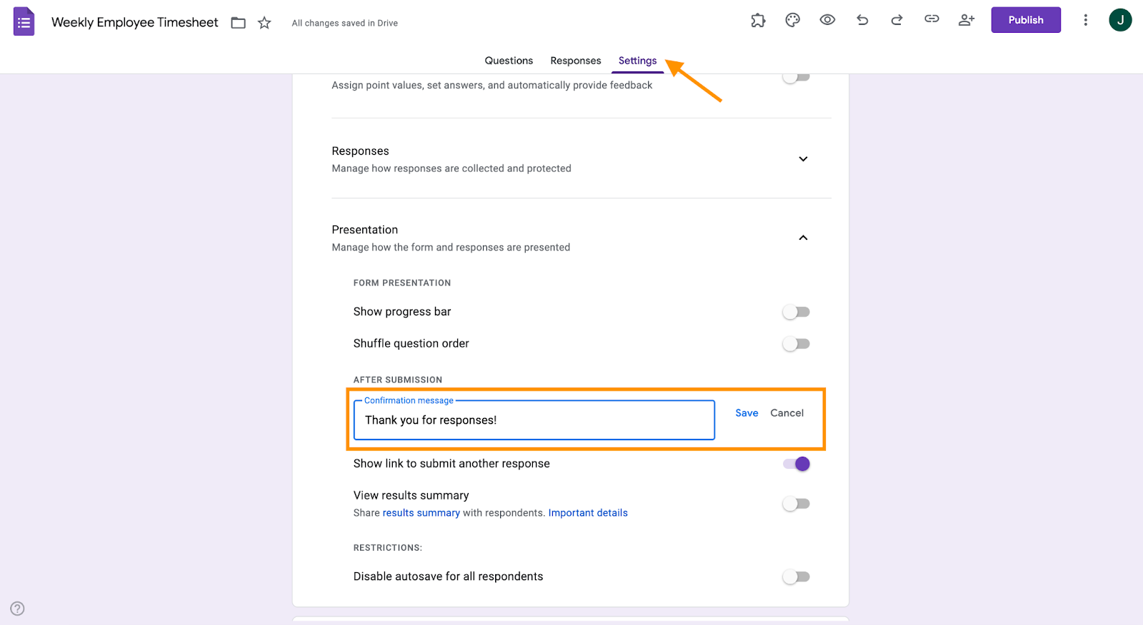 - Customize the confirmation message: Let respondents know their timesheet was successfully submitted.