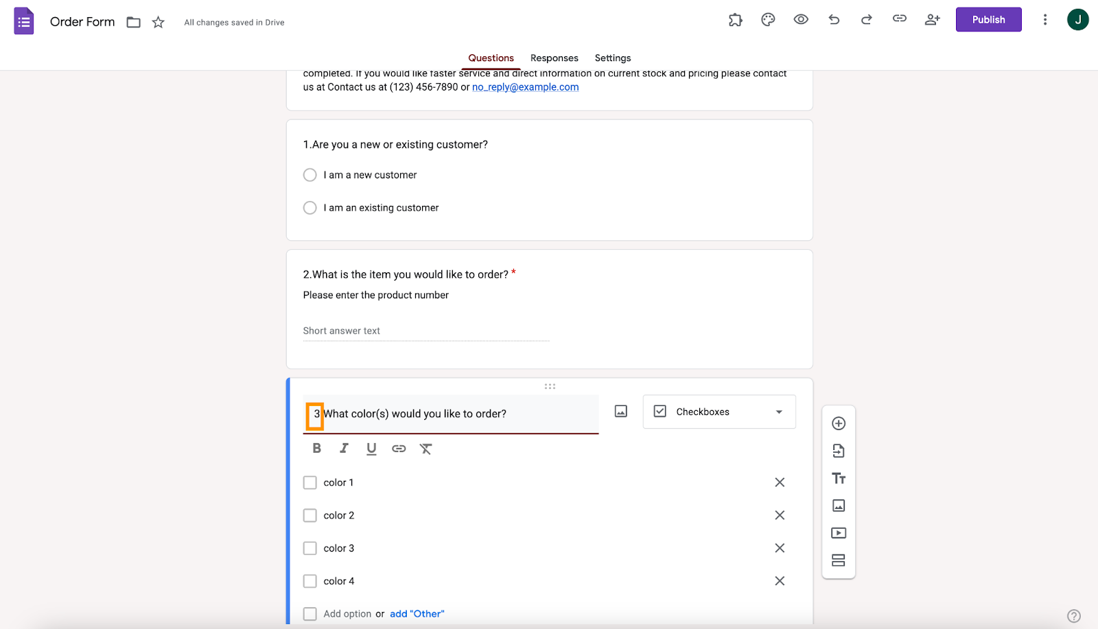 Regularly check your numbering as you add or rearrange questions. Google Forms does not update numbers automatically.