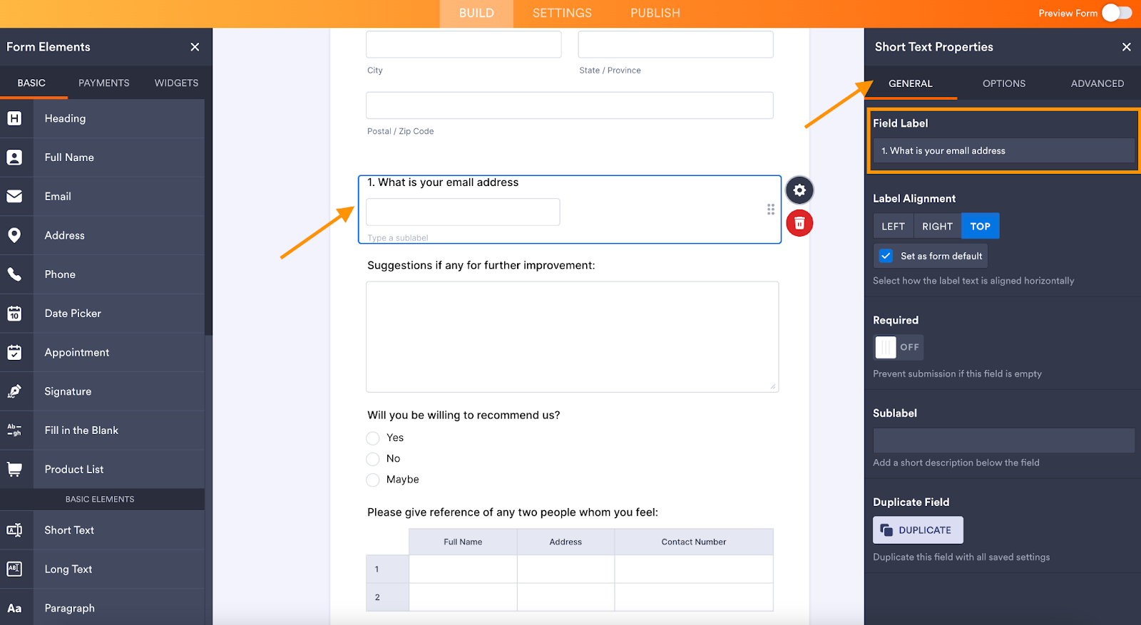 - In Form Builder, select Add Element. Then click on the gear icon next to it Click on the question field label and type the number directly into the label text. For example, “1. What is your email address?”