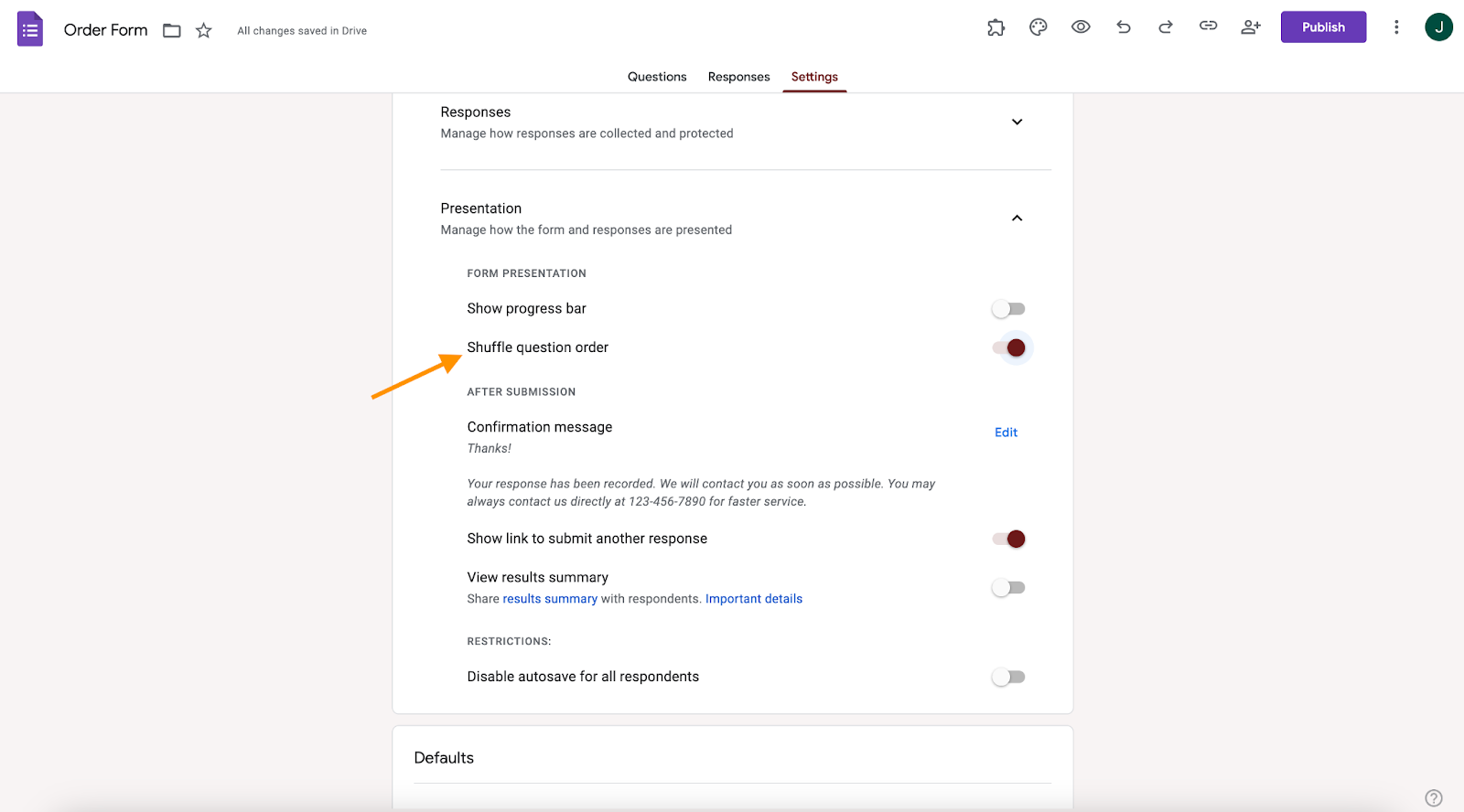 - Google Forms will automatically save your changes. Your questions will now appear randomly to each respondent.