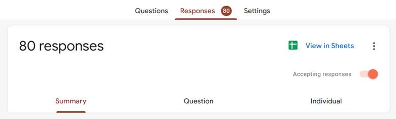 Google Forms offers a simple built-in dashboard which shows you a basic summary of the responses, and it also enables you to read each submission by clicking on their Individual view. You can see responses in Google Forms and view visual summaries of responses as a whole, but you don’t have the option to sort or filter the data.