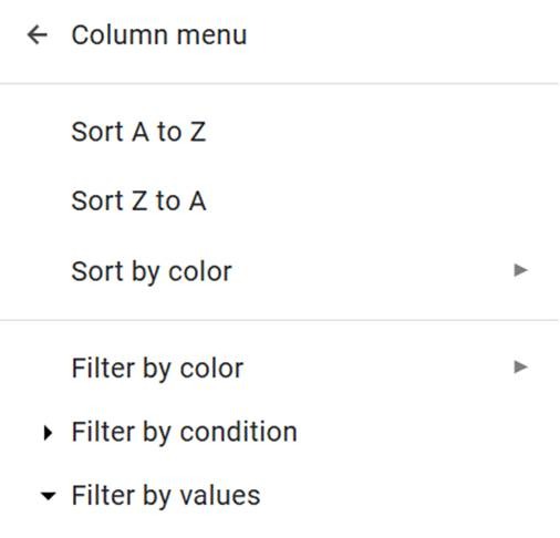 Then, use the drop-down arrow on each column to choose filter conditions. You can filter by values (such as the text or numbers in each row), by condition (such as “greater than”), or by color (text or fill color).