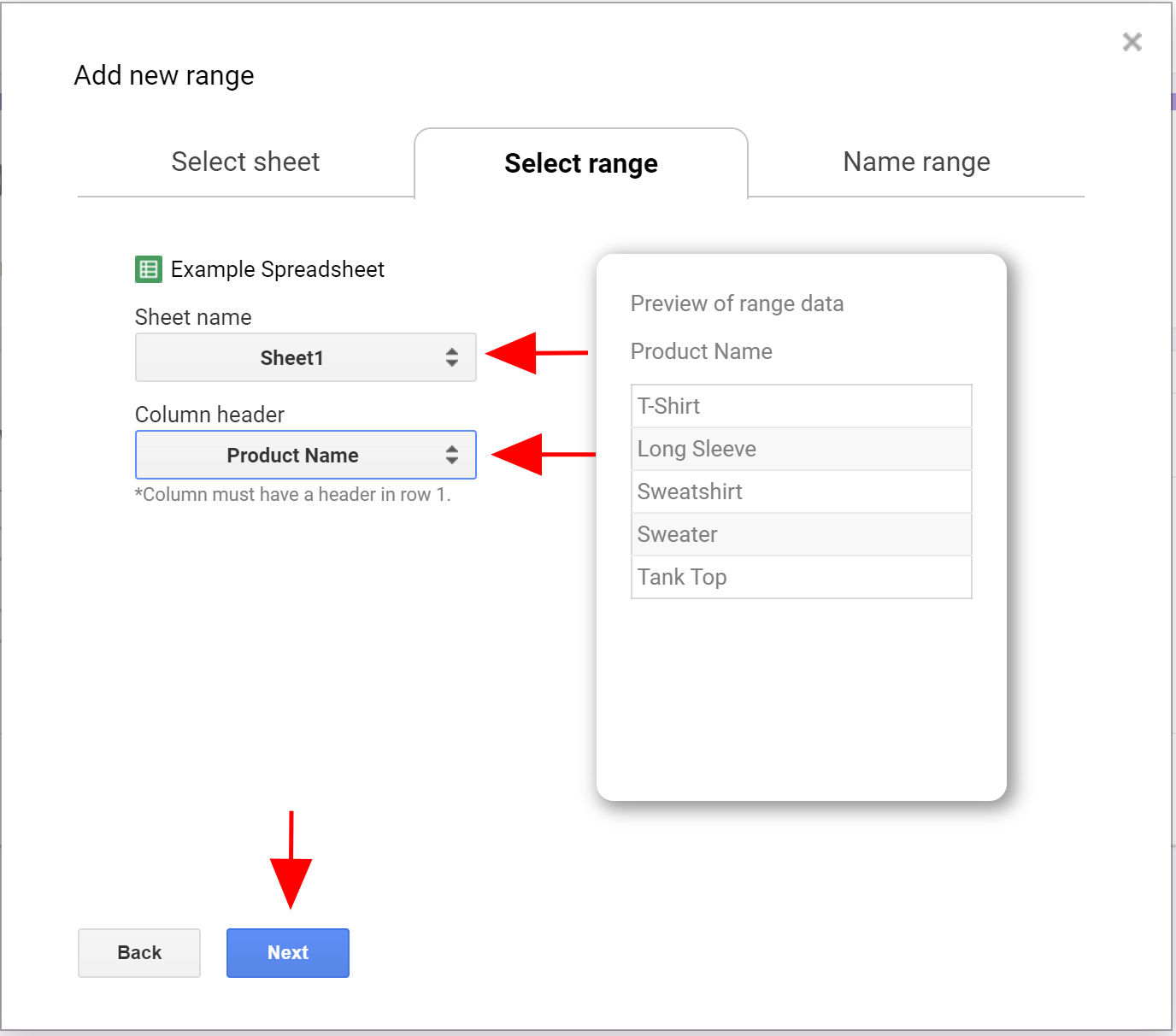 - Select the sheet that holds data under Sheet Name, and the column you want to use under Column header.