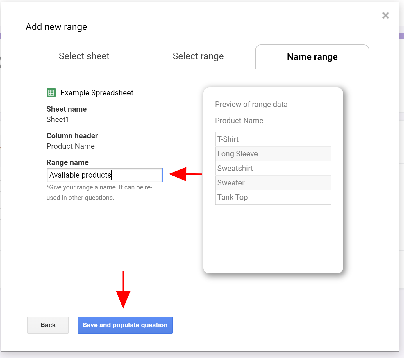 - Fill in the name of this data range in the text box under Range name and click Save and populate question to update your question.