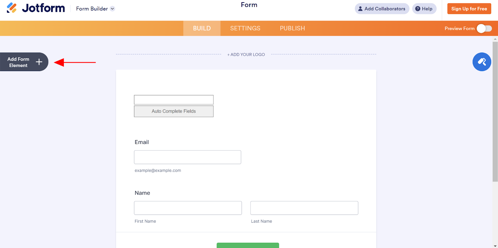 - Click on the Add Form Element button on the left side of the Jotform Form Builder.