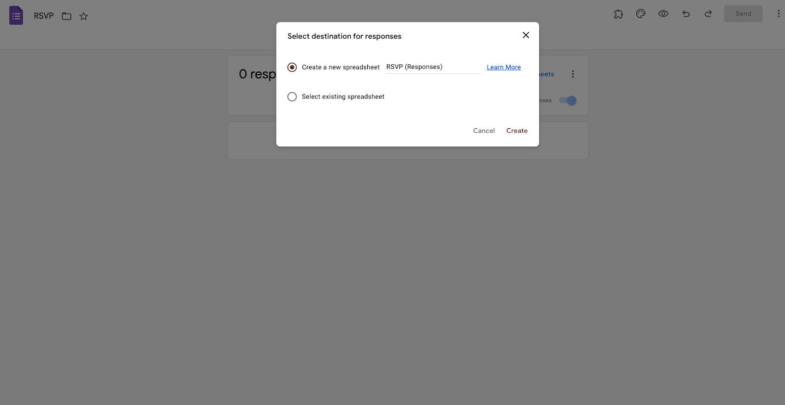 Now you can connect your form to a new or existing spreadsheet. When you’ve made your selection, click Create.