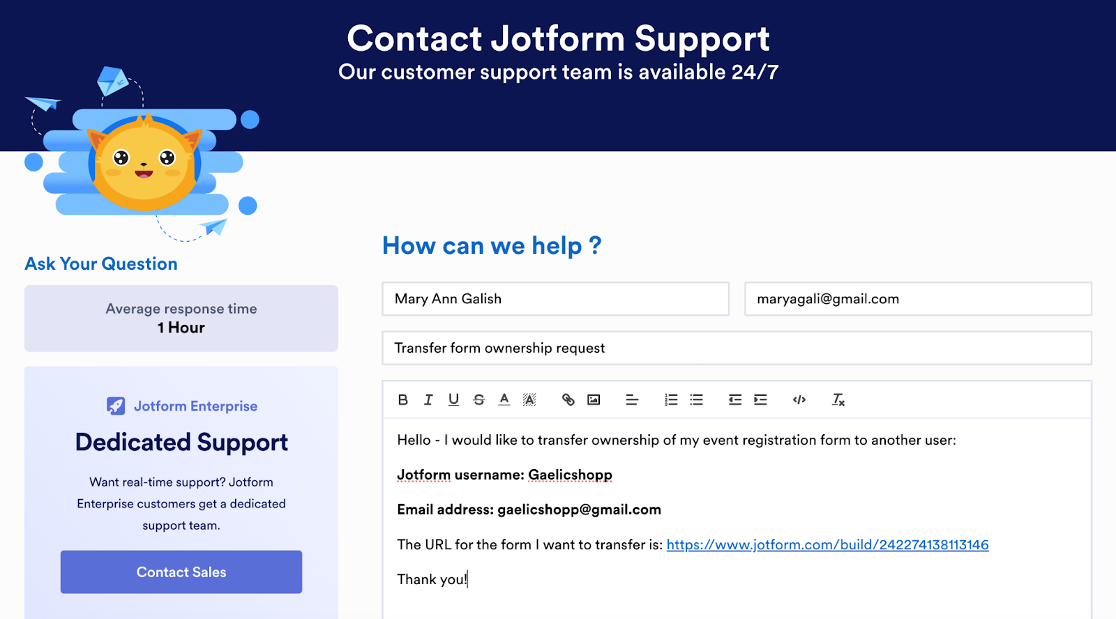 - Contact Jotform Support by going to www.jotform.com/contact/.