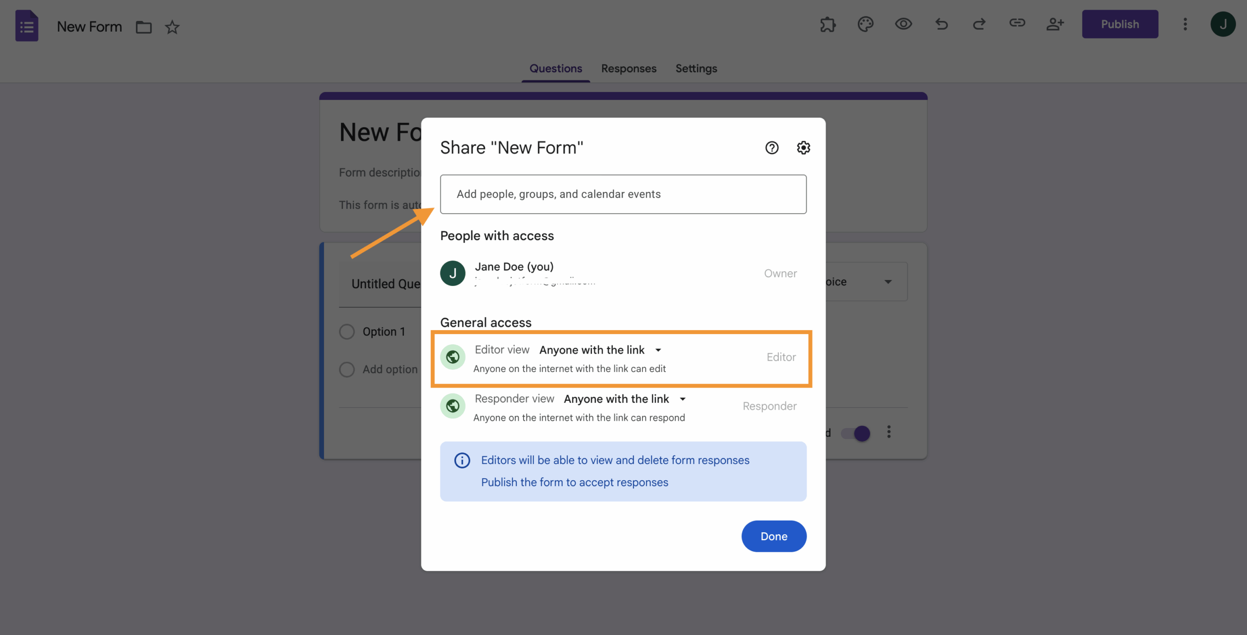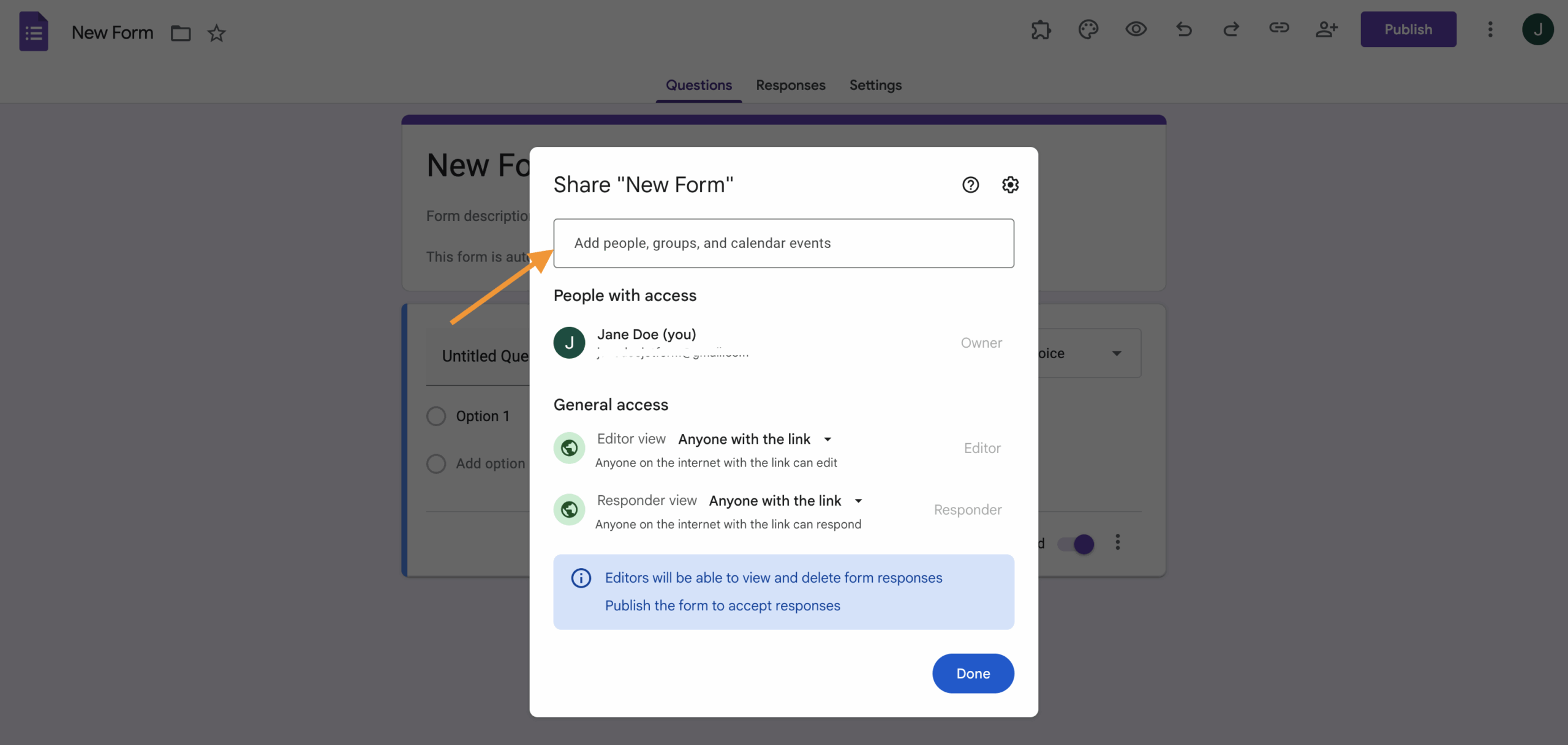 - Type in the email address of the new owner of the Google Form.