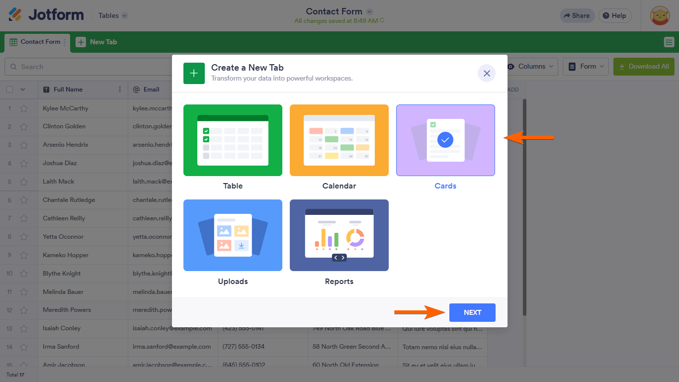A Cards view in Jotform Tables displays your form submissions in a grid layout. This allows you to view data on each submission quickly. You can also selectively display specific fields on each card to get a quick glimpse of the information you need.