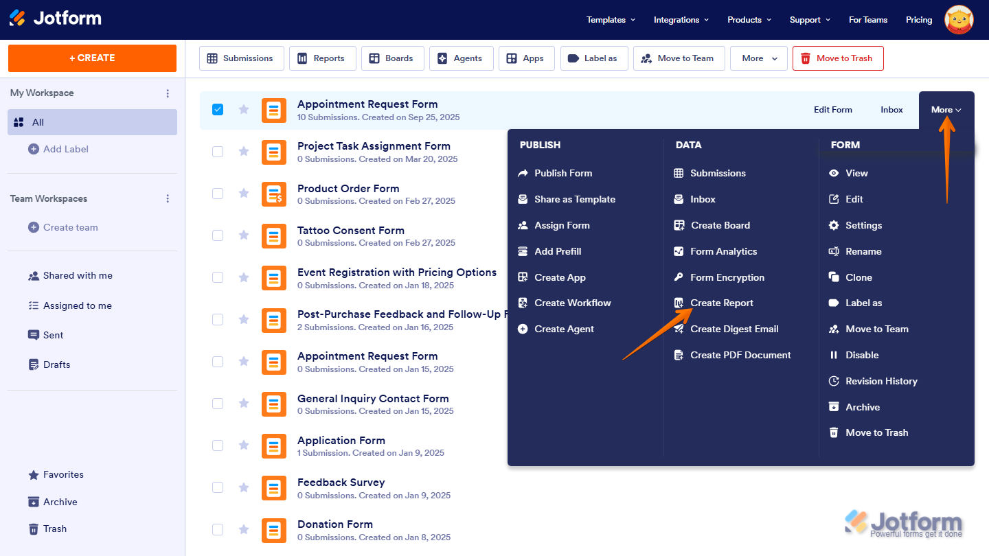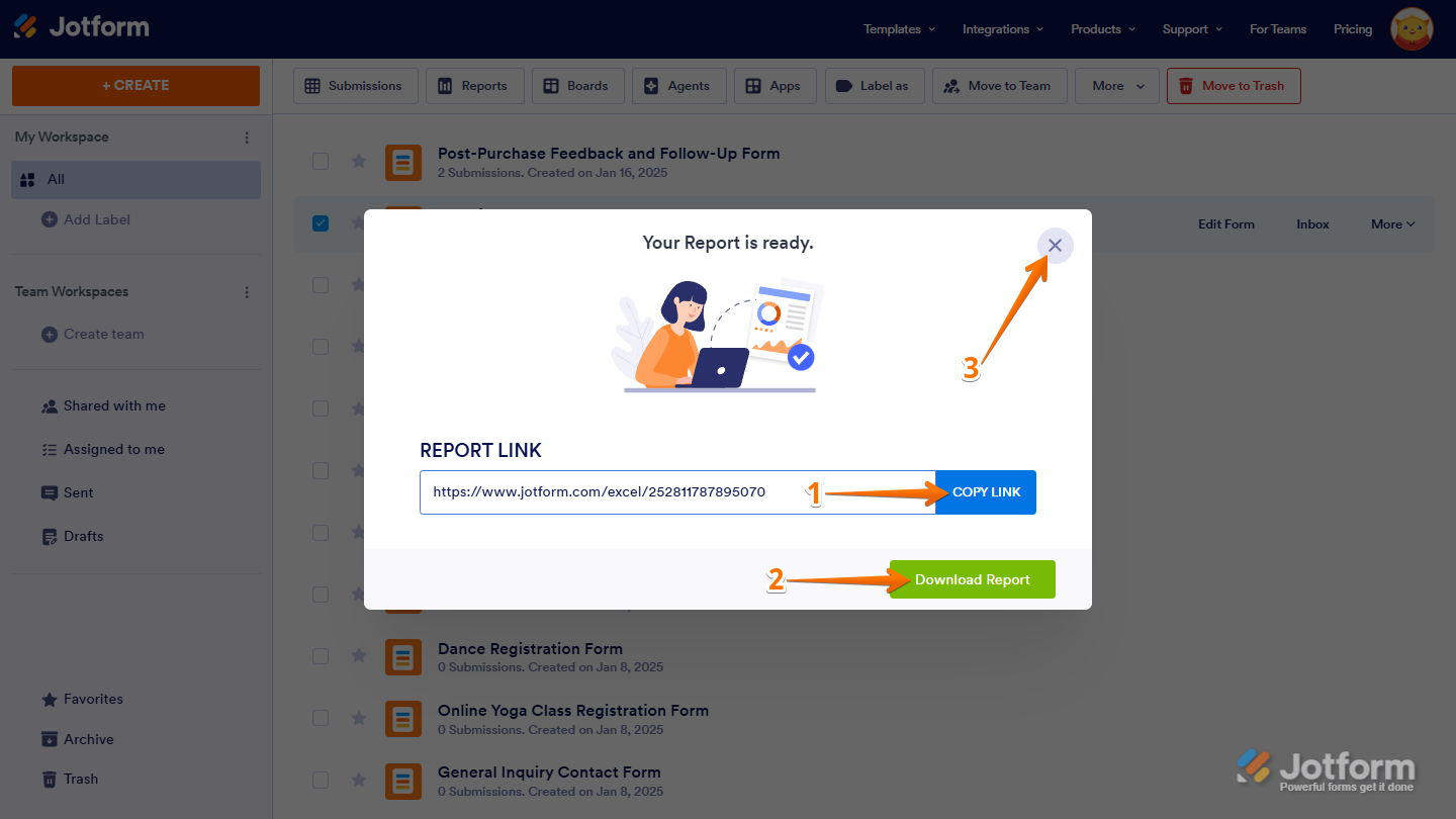 That’s it. With Jotform’s Excel Reports, you can efficiently organize, analyze, and share your form submission data. Whether you need to track responses, generate insights, or collaborate with your team, this feature streamlines the process.