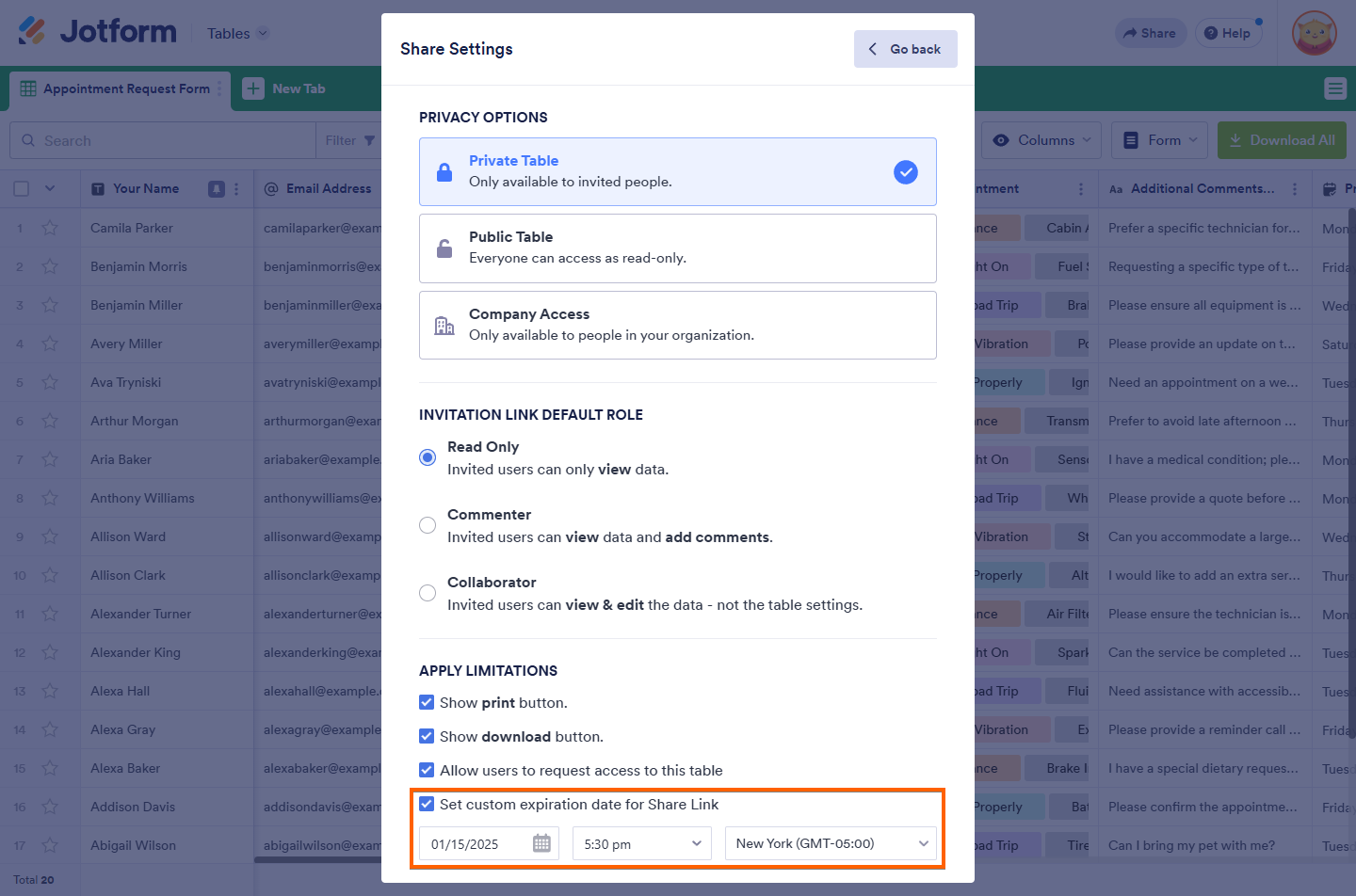The Set custom expiration date option is straightforward. If you want to limit access to your table, set an expiration date for the invitation link in the main window.