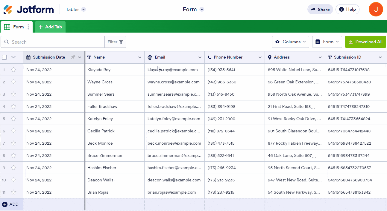 When working with Jotform Tables, you have the flexibility to show or hide columns based on your needs. This allows you to stay focused and manage your data effectively. You can change your columns’ visibility with the Columns button as well as the tab and column menus.