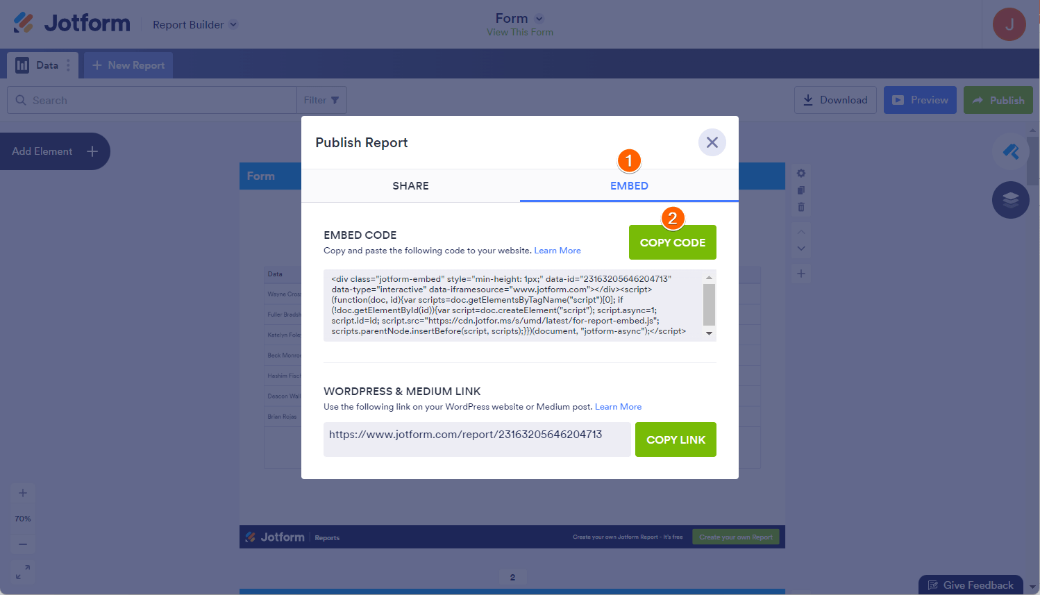 You can choose to get the Embed code for the Visual Report or the link for WordPress and Medium websites.