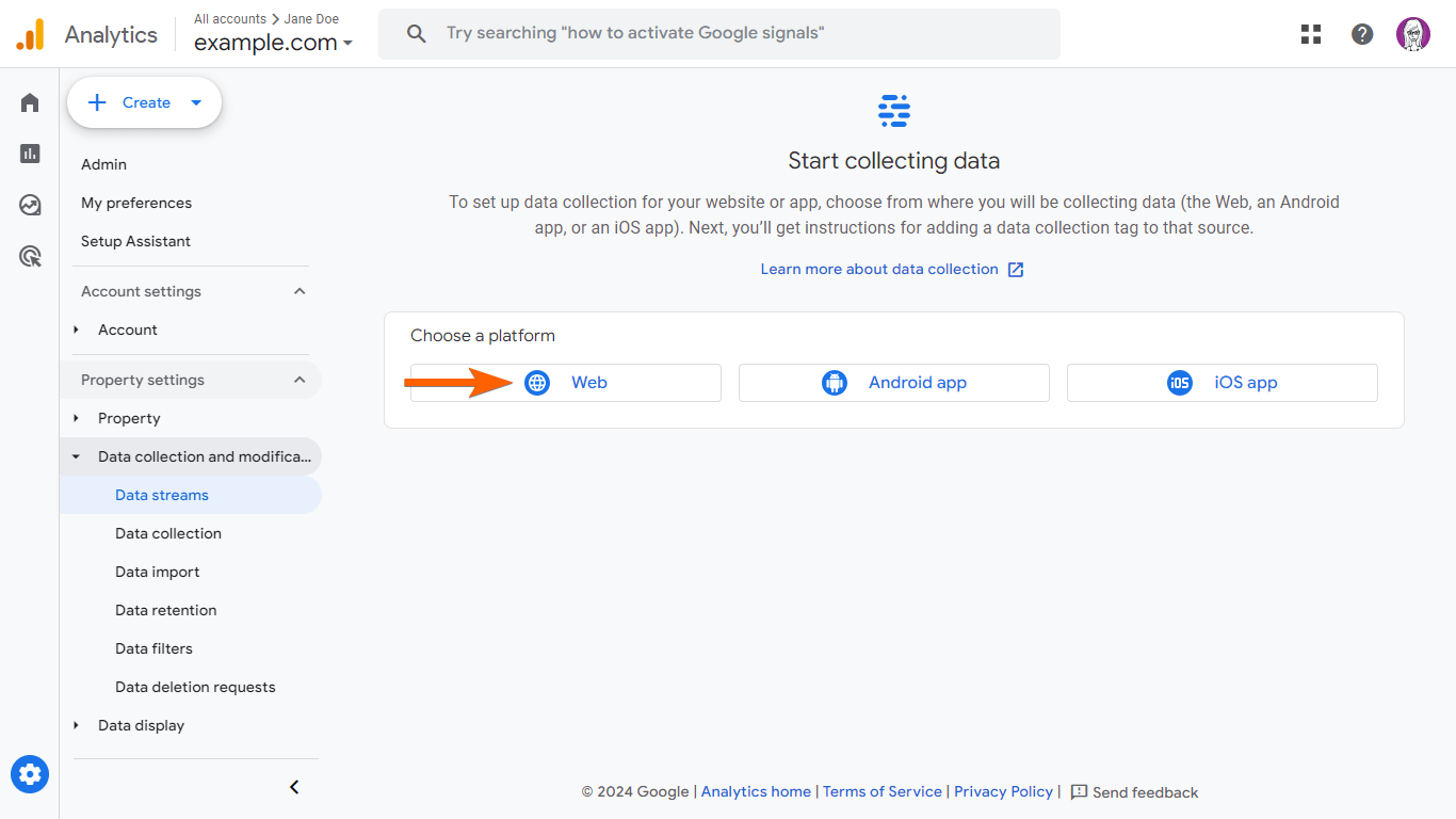 Google Analytics is a service that allows you to track events on your form. The following shows how to use Google Analytics on your form using a new property and data stream in an existing GA4 admin account but you can use your existing ones. See How to Set Up Analytics to get started with Google Analytics 4.