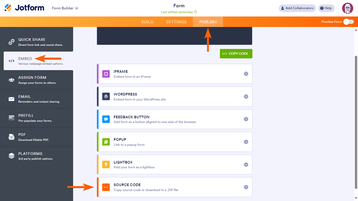 - Copy the provided code and embed it into your website. See How to Get the Full Source Code of Your Form for more information.