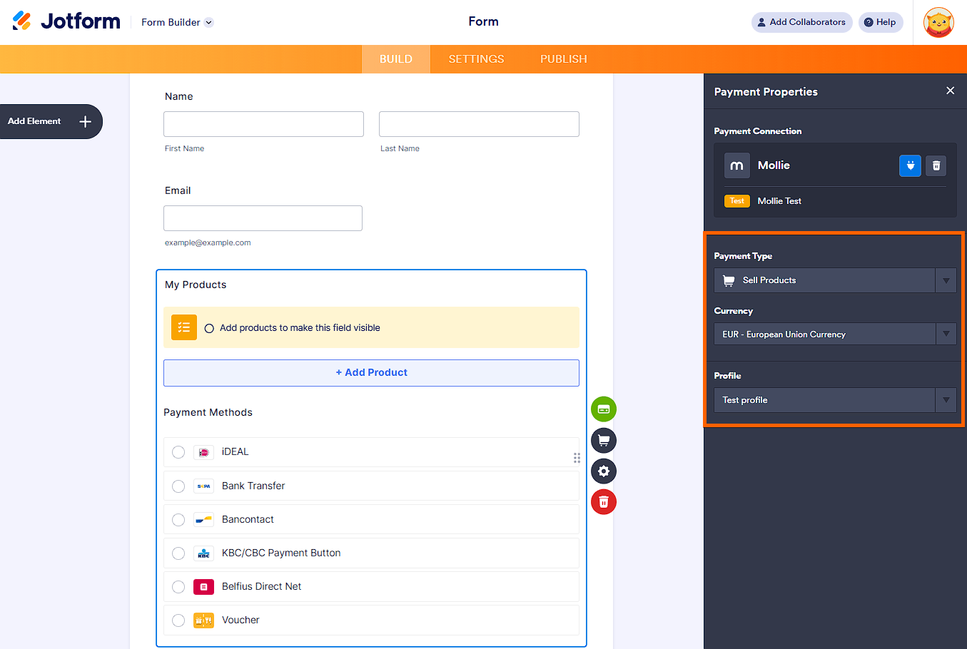 Mollie is a leading European payment provider which operates in all European Economic Area (EEA) countries and Switzerland. Jotform’s Mollie integration allows you to accept payments via 20+ payment methods, including Apple Pay, iDEAL, Klarna, and PayPal.