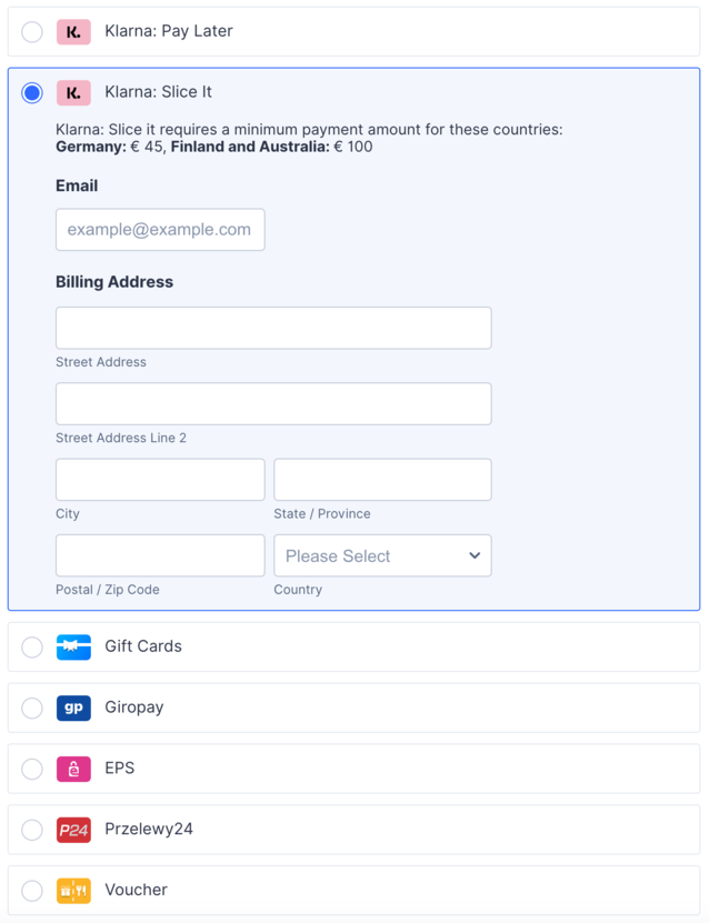 - Klarna: Pay Later, Klarna: Slice It, and Voucher require an extra Email and Billing Address when your form users select them. Users must fill in these fields to pay.