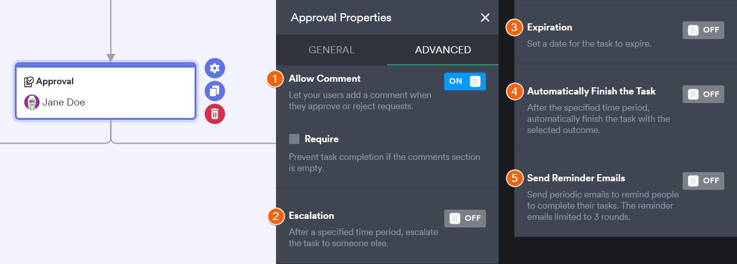 - Automatically Finish the Task — Set the approval to automatically select an outcome after a certain period or date.