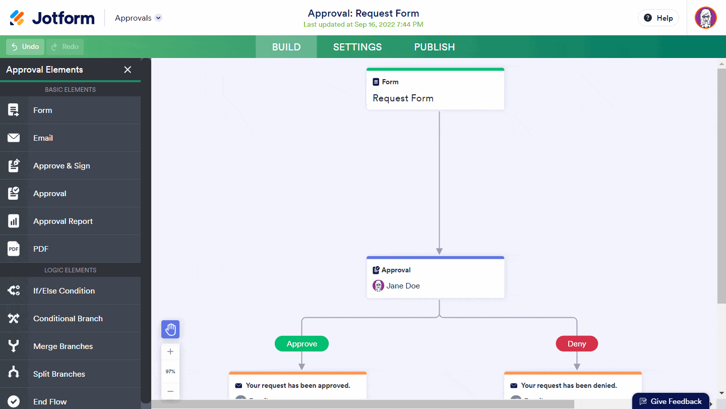 The drag-and-drop feature of Jotform Workflows lets you effortlessly add elements to your canvas. You can also reposition existing elements to improve the layout, making it easier for anyone reviewing your workflow to understand how everything connects.