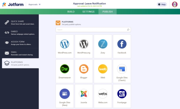Go to the Platforms tab to share your forms via third-party platforms like WordPress, Squarespace, Wix, and more.