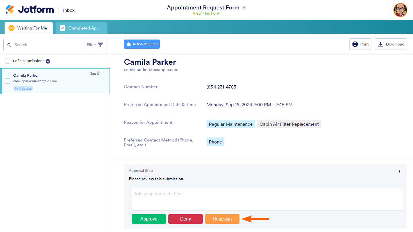 When this Approval element property is enabled in your workflow, your approvers will see a Reassign button next to the approval buttons of the Approval Step in Jotform Inbox.