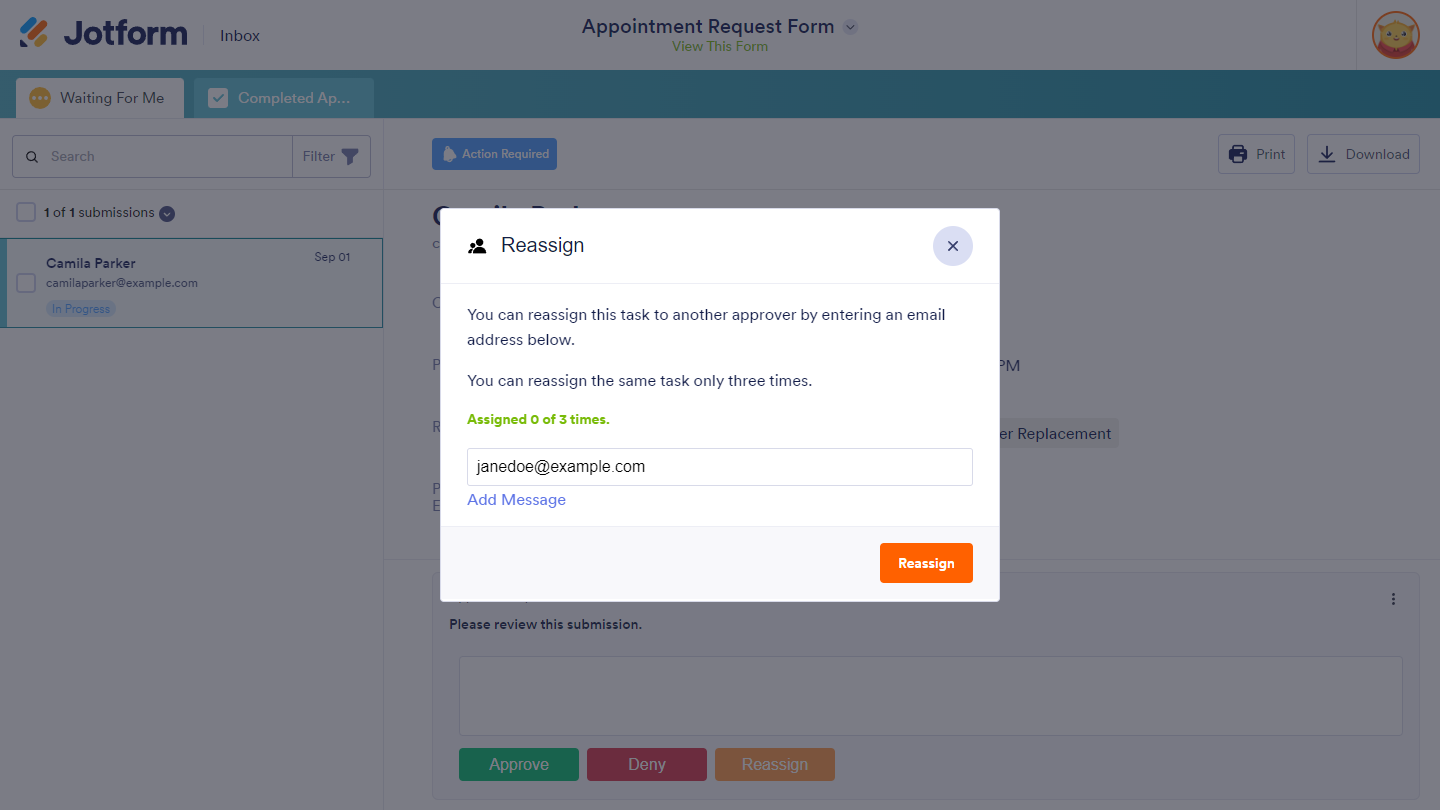 This allows them to reassign the request to another person, up to three times, by sending it to that person’s email address in the Reassign modal window.