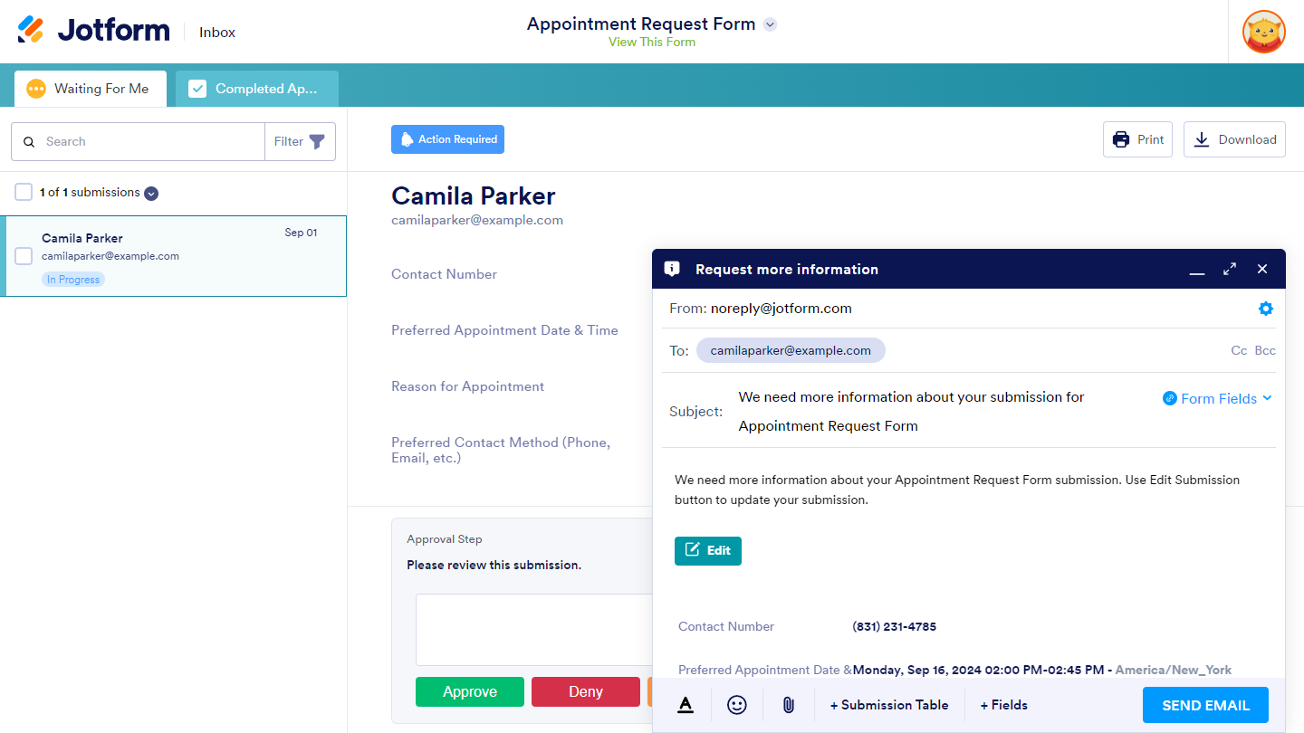 This allows your approvers to send an email to the person who submitted the request or anyone else to ask for more details about the submission before completing the task.