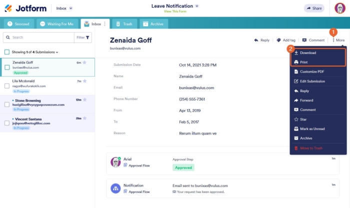 - The Reassign and Request More Information features are only available when approvers complete their approval tasks in Jotform Inbox while logged in to their accounts.