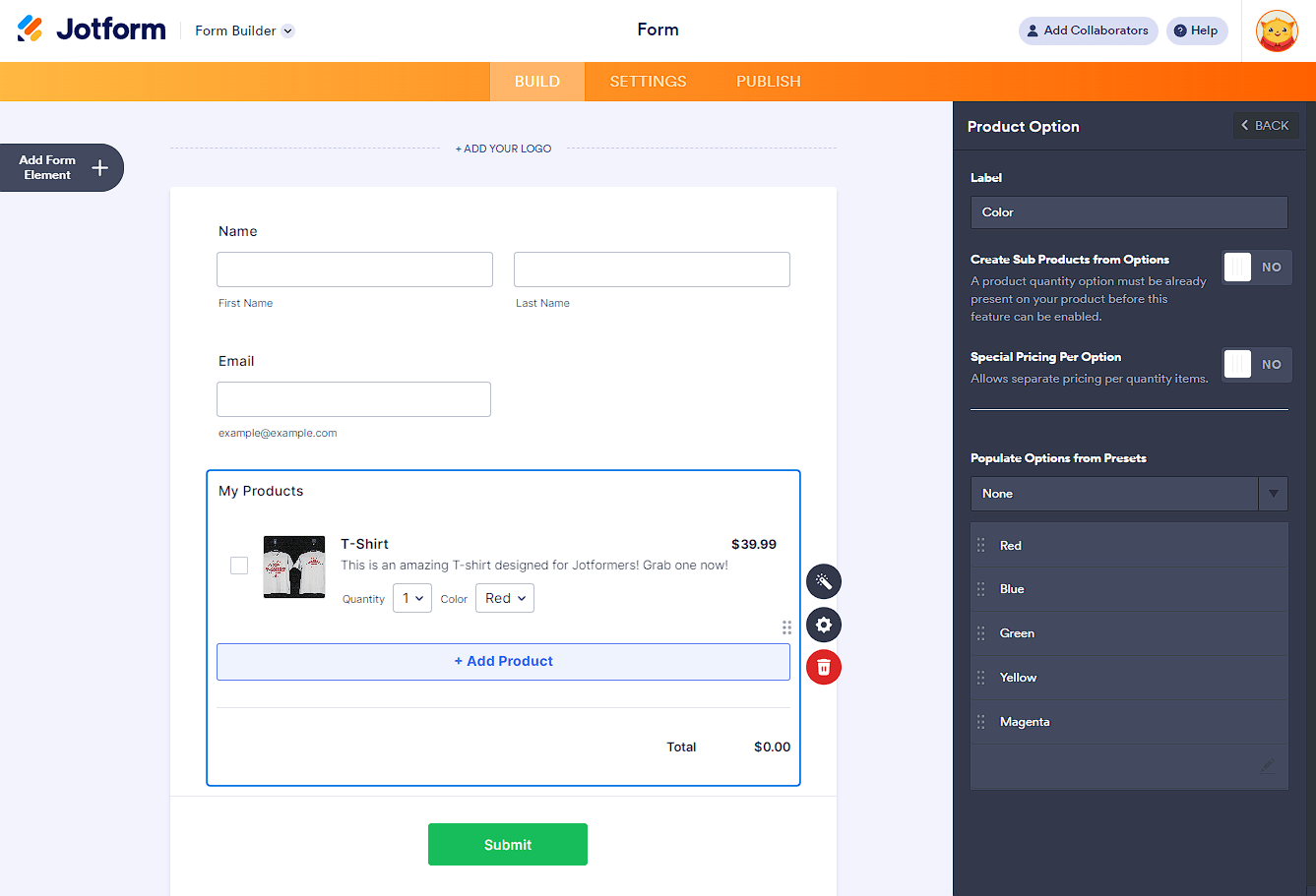 - Populate Options from Presets — Jotform has a present for the Color, T-Shirt Size, Print Size, Screen Resolution, and Shoe Size. Select one to populate the options automatically.