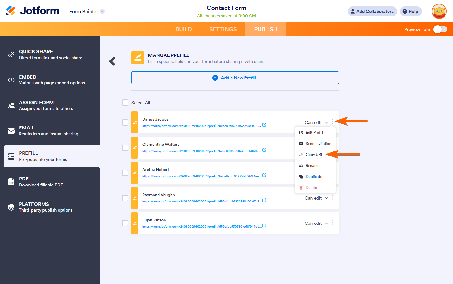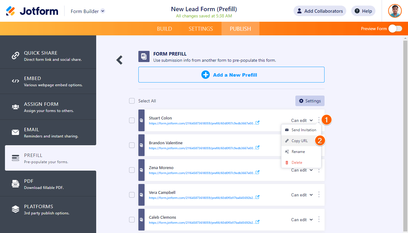 Jotform’s Prefill feature lets you send prefilled URLs directly from the Form Builder. You can either send up to five prefilled URLs at once, or share them individually. Let’s do it!