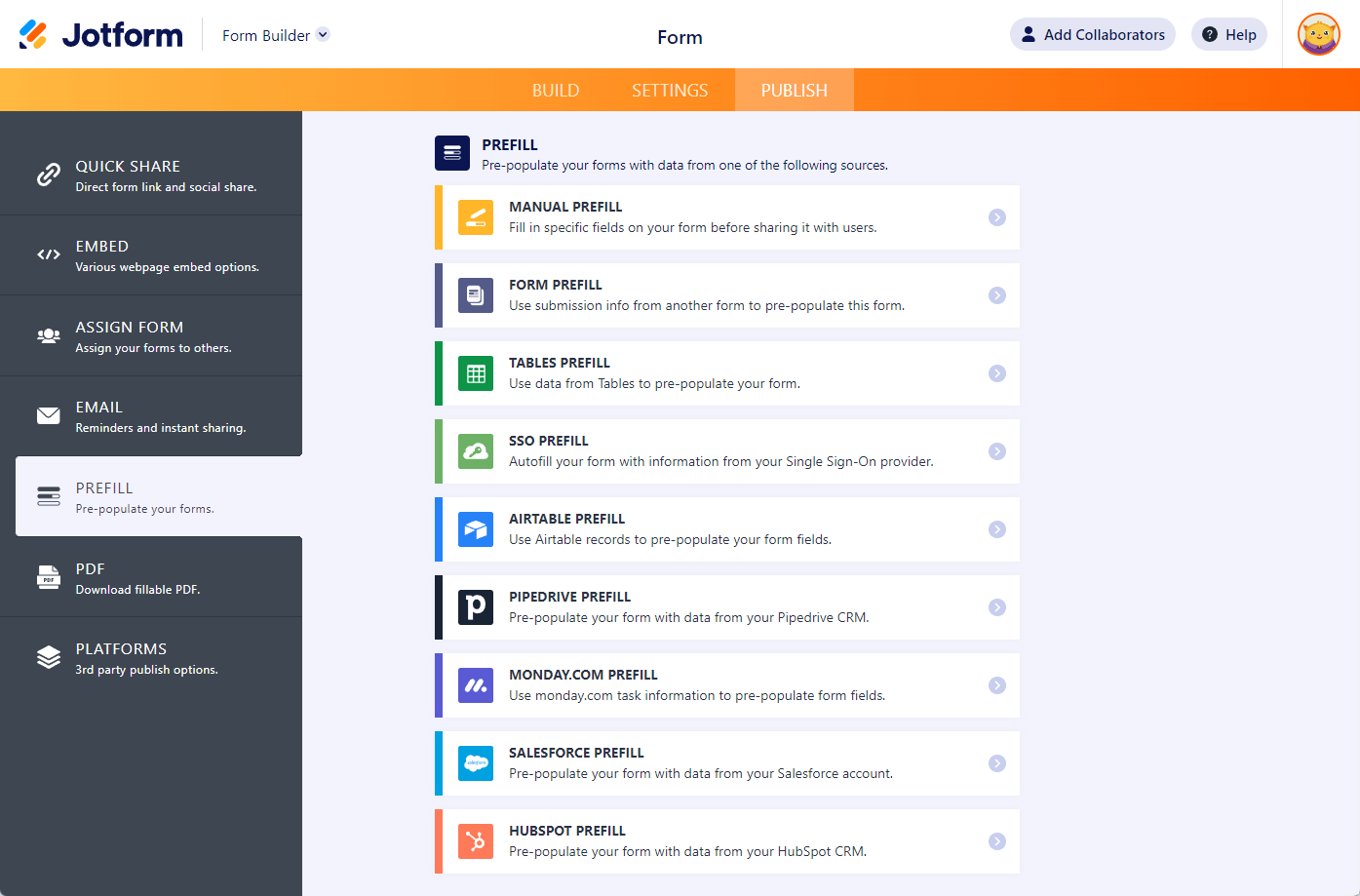 You can access Prefill in the Form Builder by going to the Publish tab and selecting Prefill on the left.
