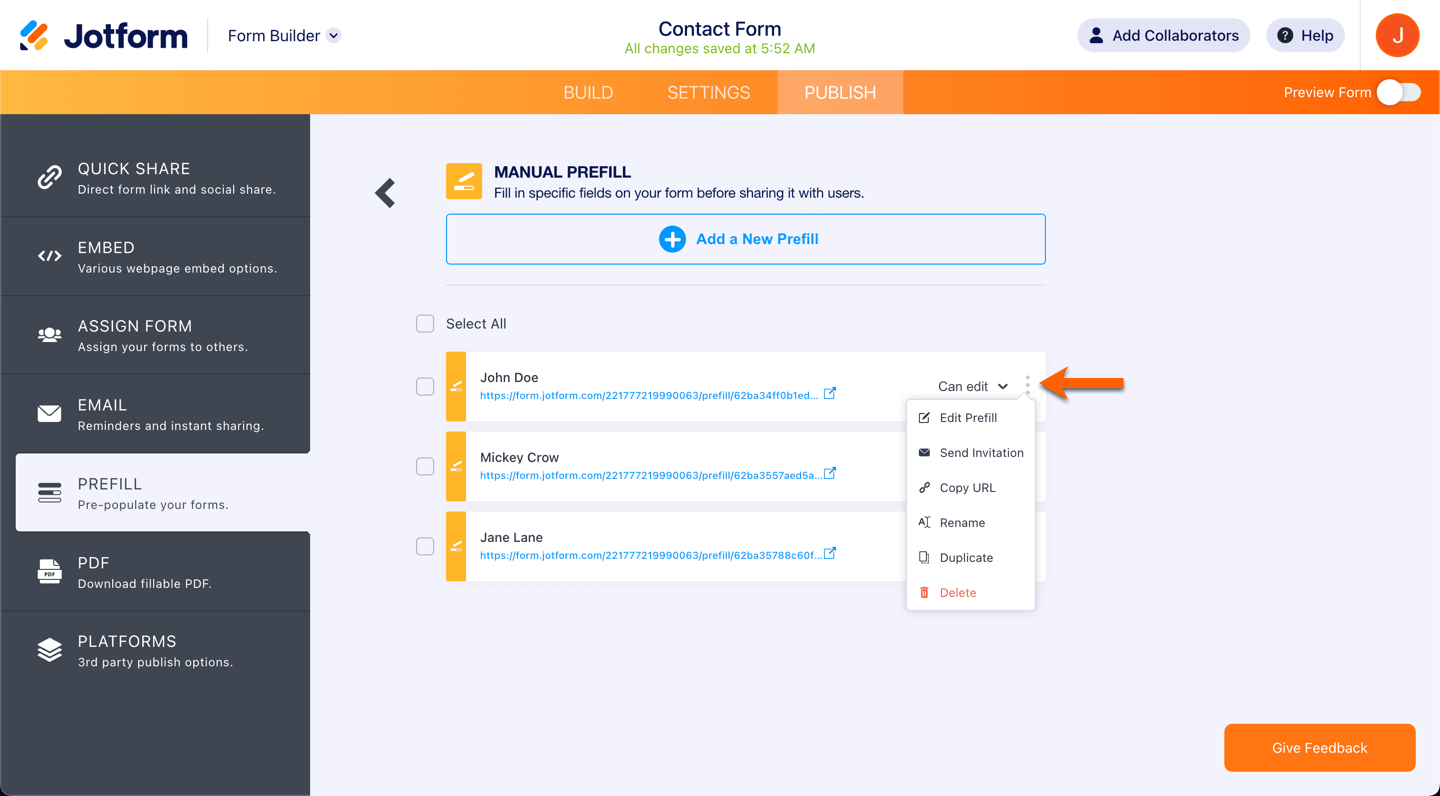On each Prefilled URL, clicking the kebab or 3-dot menu will allow you to do the following: