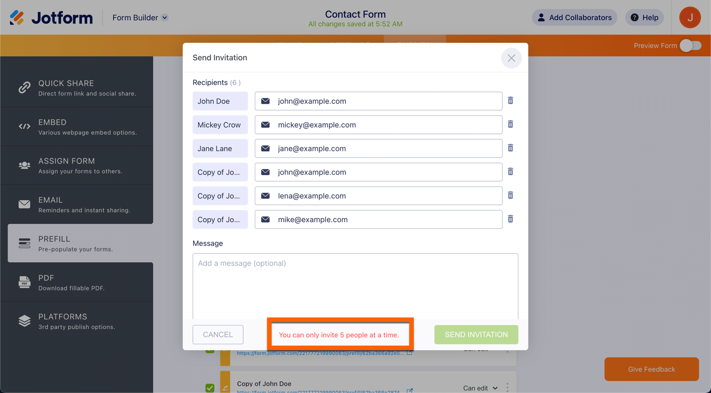 You can select all Prefilled URLs, but you can only send an invitation to up to Five (5) people at a time. Selecting and sending more than this number will display an error message.