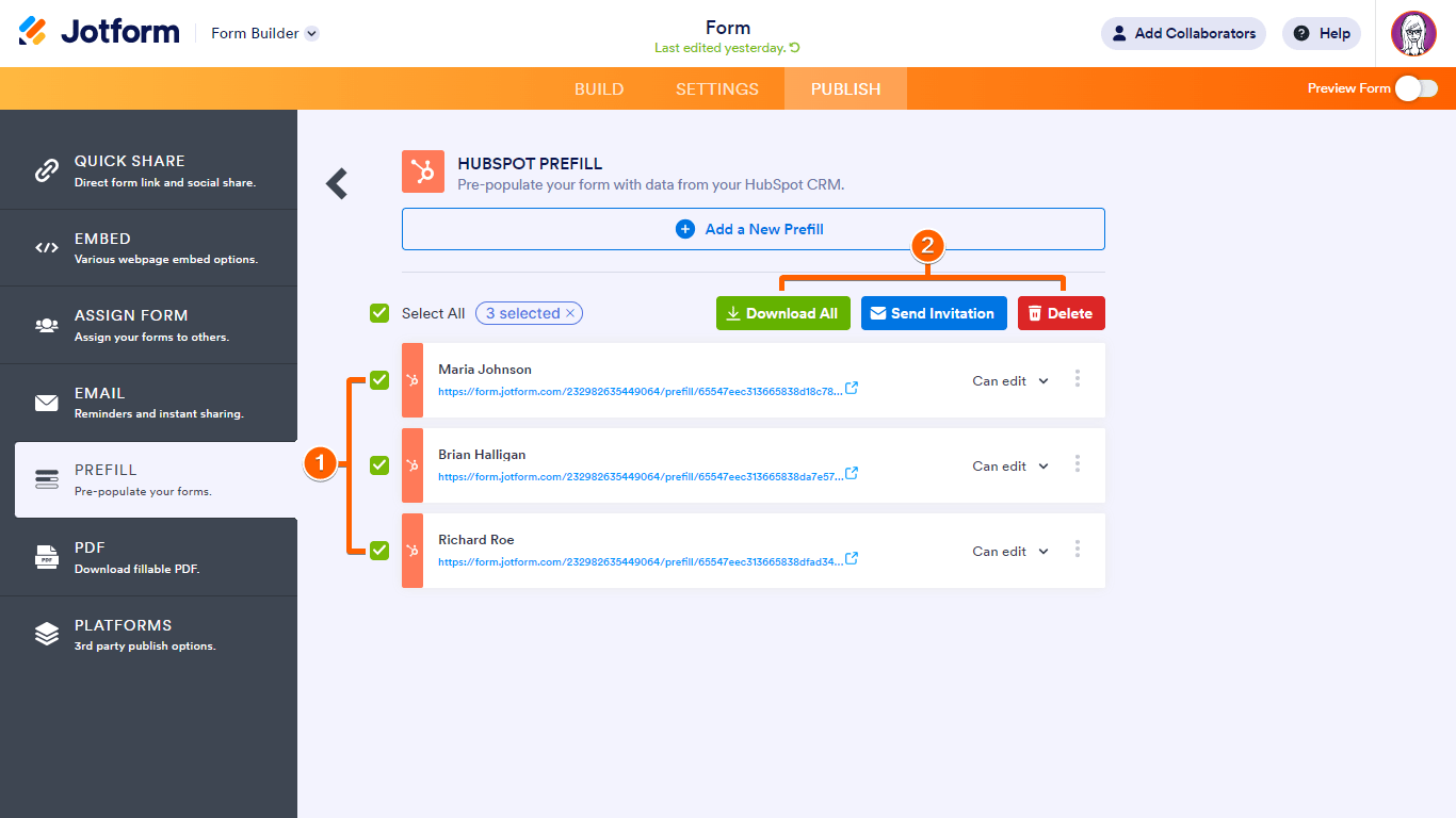 - To share your form with the prefill data, open a prefill entry’s menu, then choose how you would to share your link.