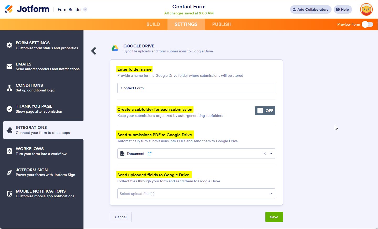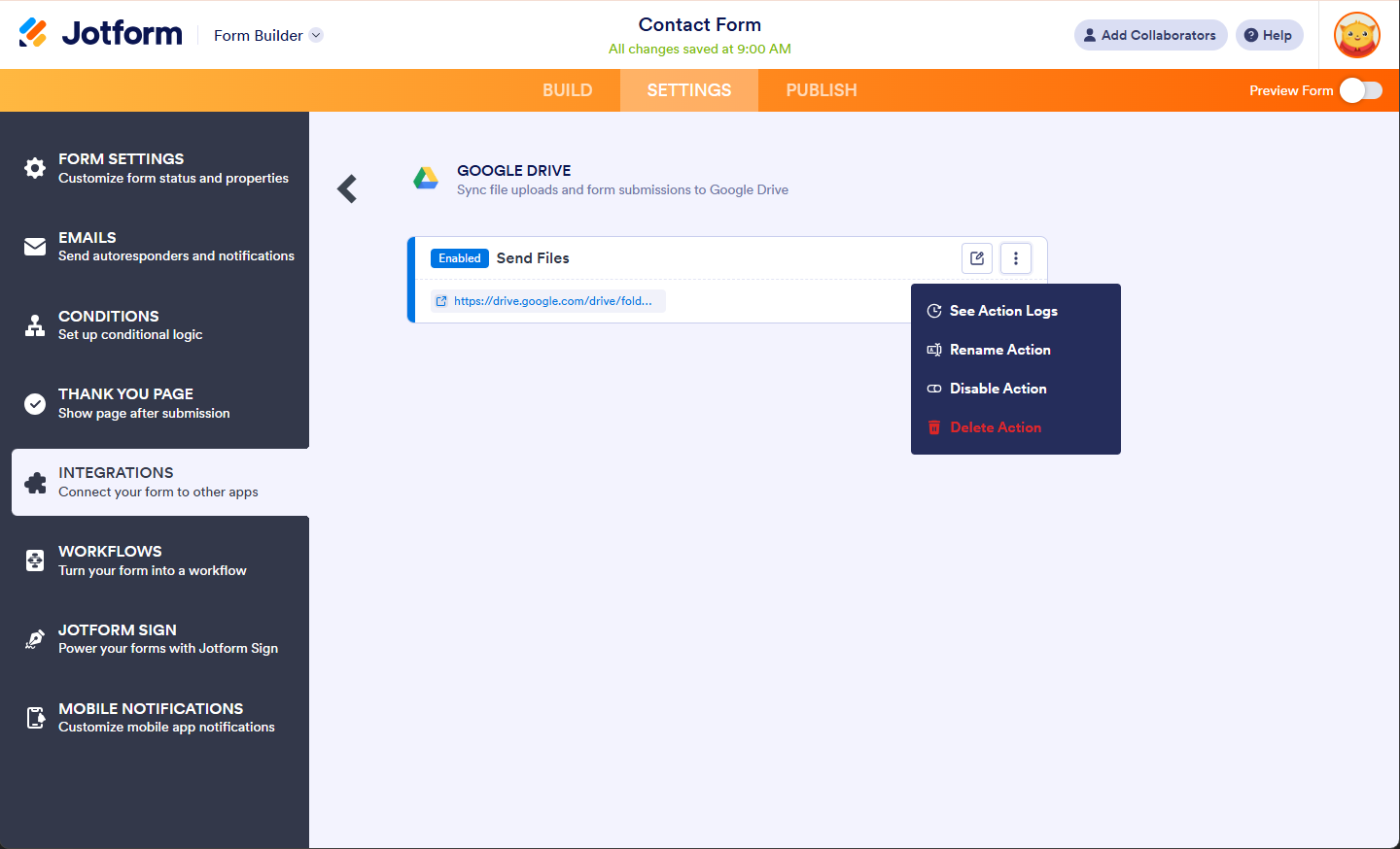 Google Drive Integration Set up in Jotform