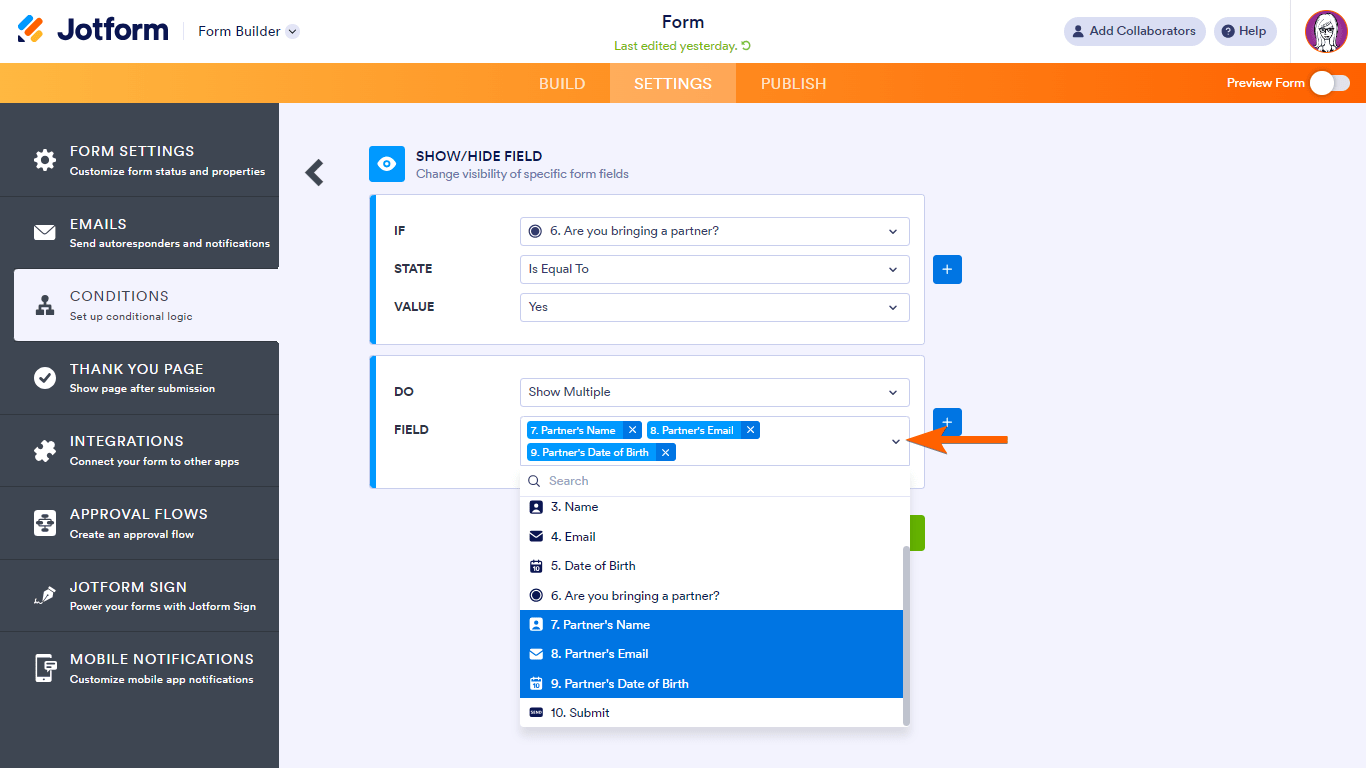 The Show/Hide Field conditional logic allows you to change your form fields’ visibility based on the respondent’s answers on your form. This is useful if you need to create a dynamic form with follow-up questions. This feature can also help shorten your forms by allowing fields to appear only when relevant.