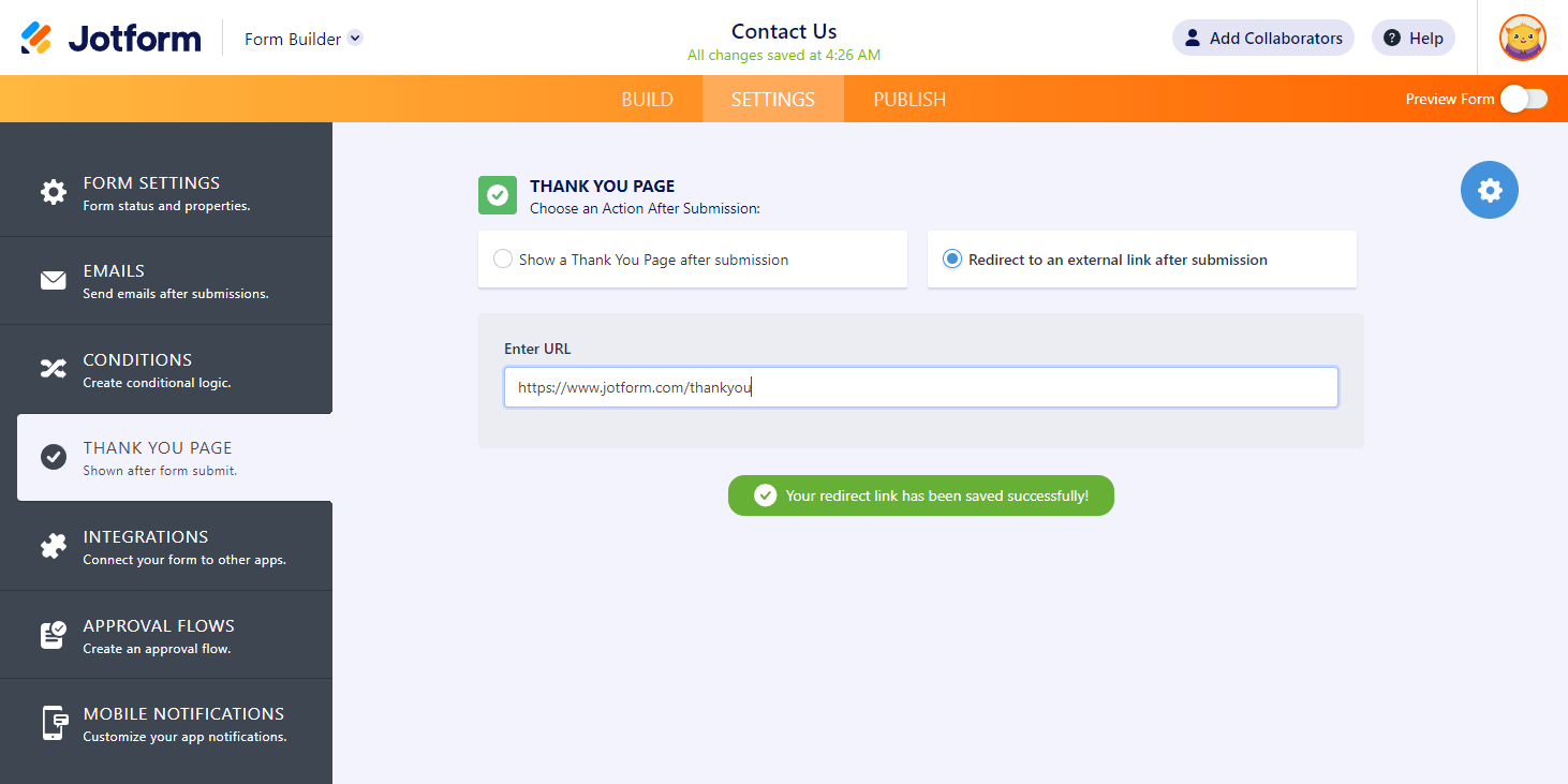 The Thank You Page is the final page your visitors see after submitting a form. Some people like to customize the page to give users a pleasing end to the experience. Others use it as a tool to redirect visitors to a specific page after completing the form.