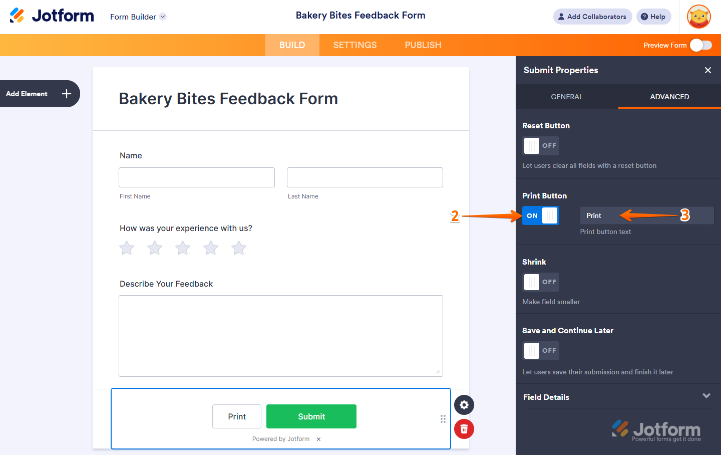 - Next, in the Submit Properties window that opens on the right side of the page, under the Advanced tab, toggle the Print button to On.