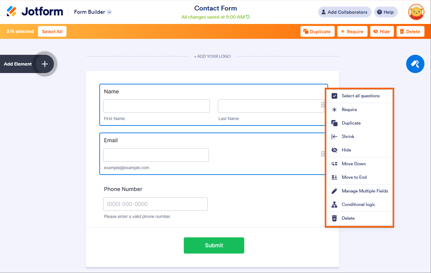 The Form Builder makes it easy to manage and organize your form fields. You can select multiple fields at once, rearrange them, or apply settings like duplicating, hiding, or deleting fields.