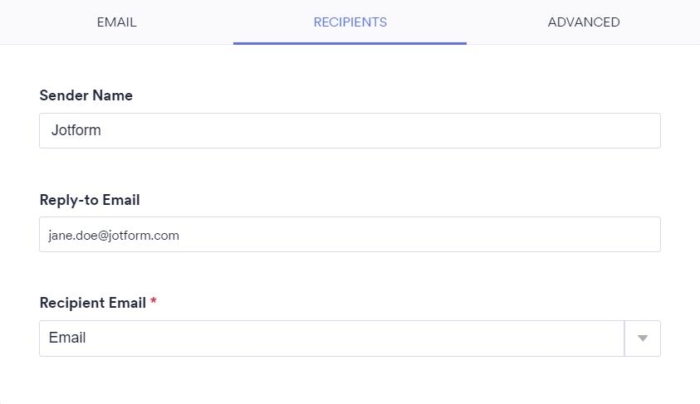 - Sender Email — Send the email using your SMTP server instead of Jotform’s servers. To learn more, see Adding a Custom Sender Address and Setting Up SMTP.