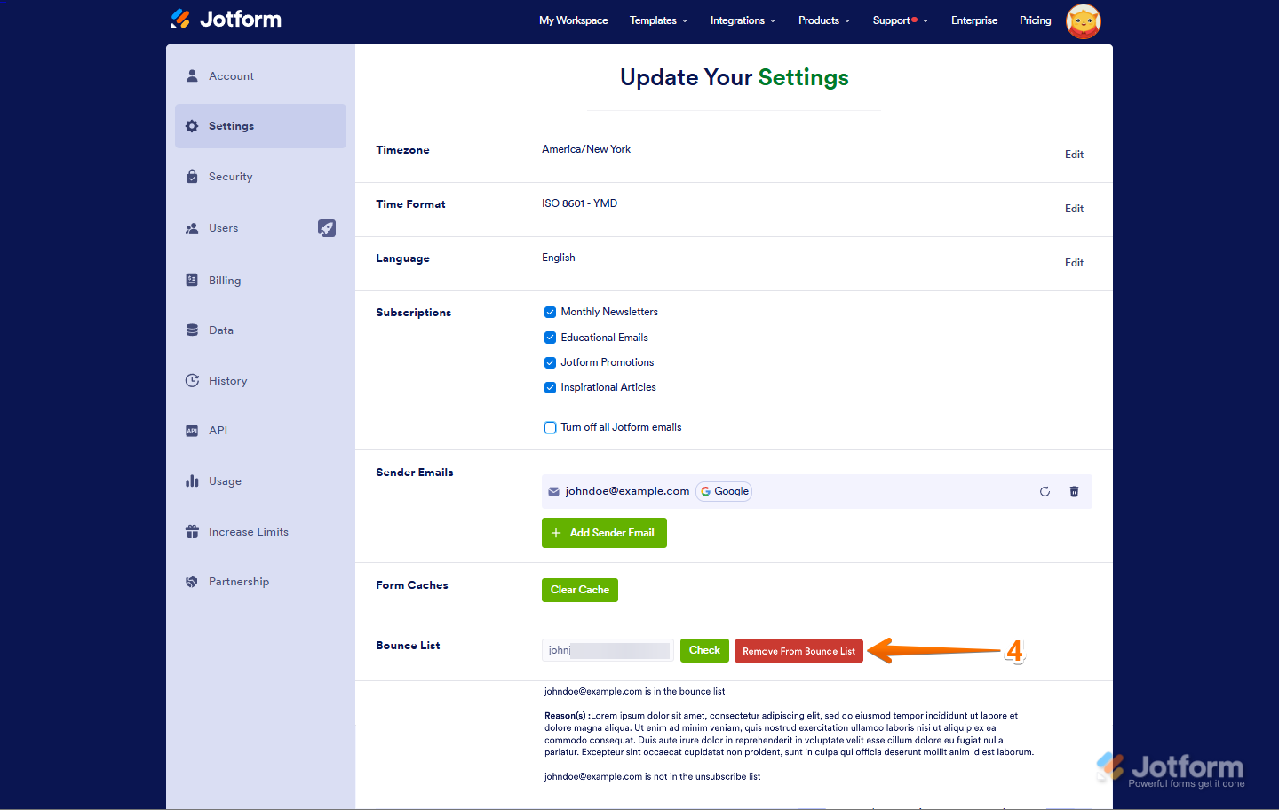 Managing your email status in Jotform by removing addresses from the Bounce List