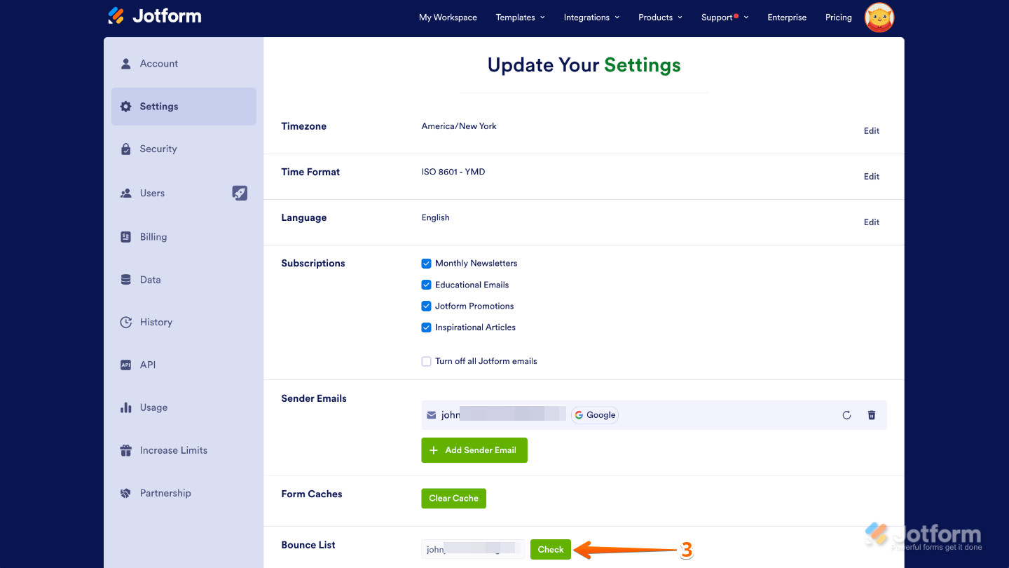 Accessing bounce list info in Jotform by clicking Check on the right side