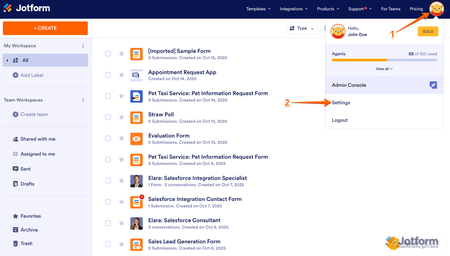 Navigating to Jotform Account Settings through the profile picture dropdown menu on the top-right of the Workspace screen