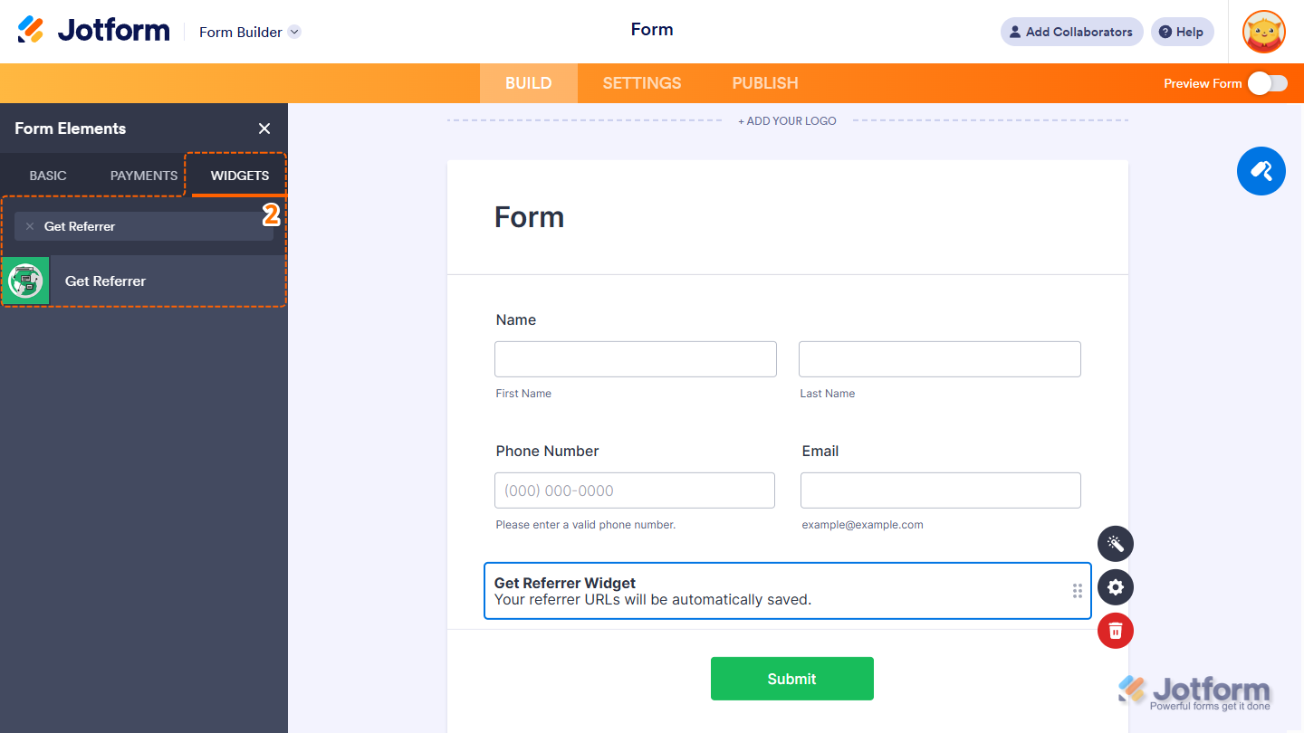 Whether you’re creating a new form or updating an existing one, you can add and set up the Get Referrer widget in a few easy steps. Here’s how to do it: