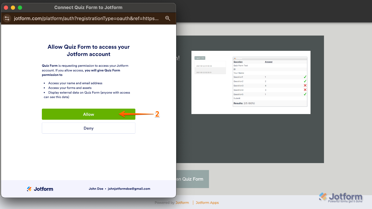 - Log in to your Jotform account in the window that pops-up, and then click on Allow to grant access to your account.
