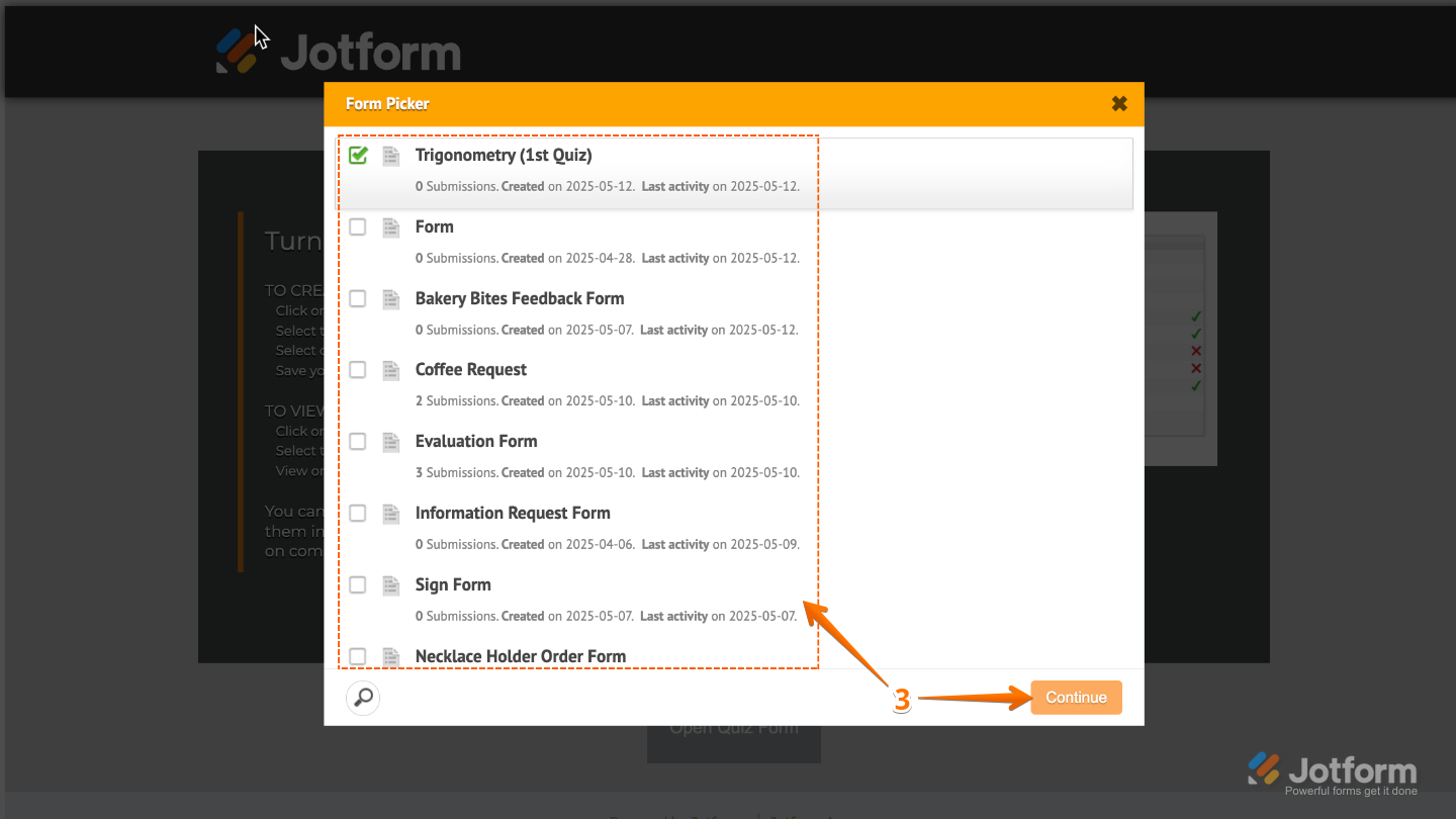 - Then, in the Form Picker window, select a form and then click on Continue.