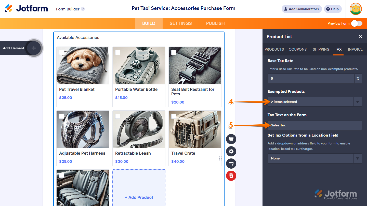 - The Tax feature is available on the Product List field and on Payment Processing Fields that support the Sell Products payment type—like Square, PayPal, Authorize.Net, Stripe, and others, except Braintree and Worldpay UK.