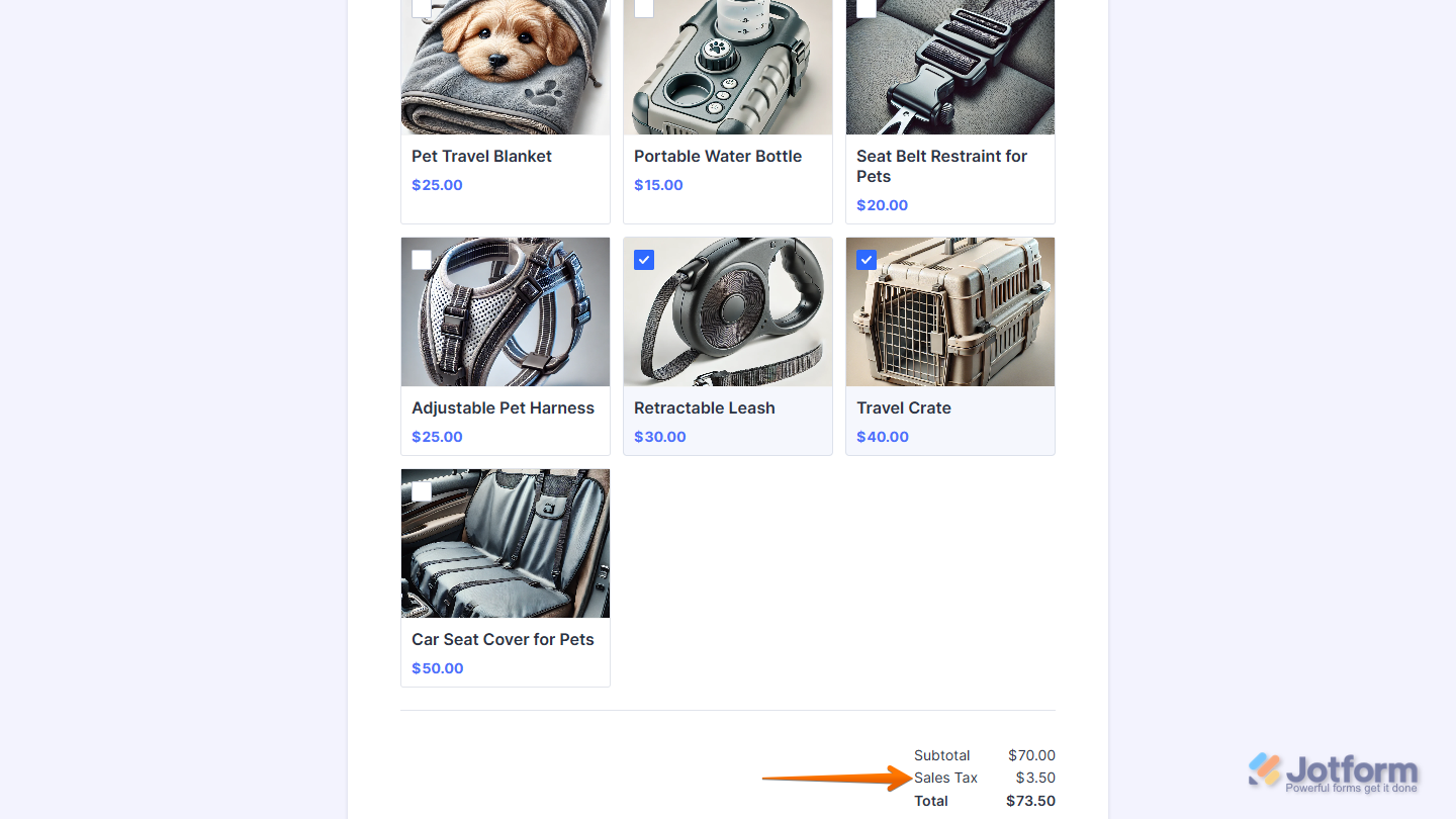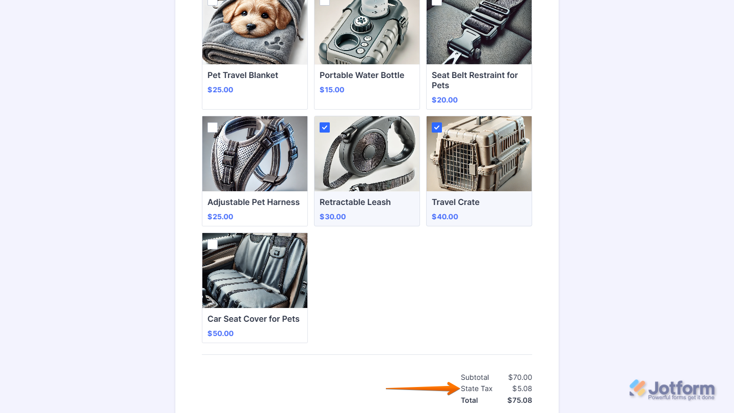 Applying tax to products on your payment forms keeps you compliant and makes pricing more transparent for your customers. You can apply sales tax as a percentage, either as a base rate or based on their location. Jotform handles the calculations automatically for each submission, ensuring accurate charges and a smooth checkout experience.