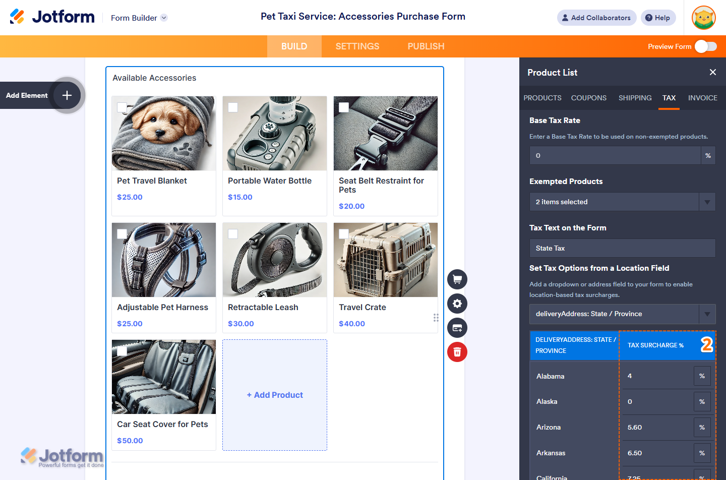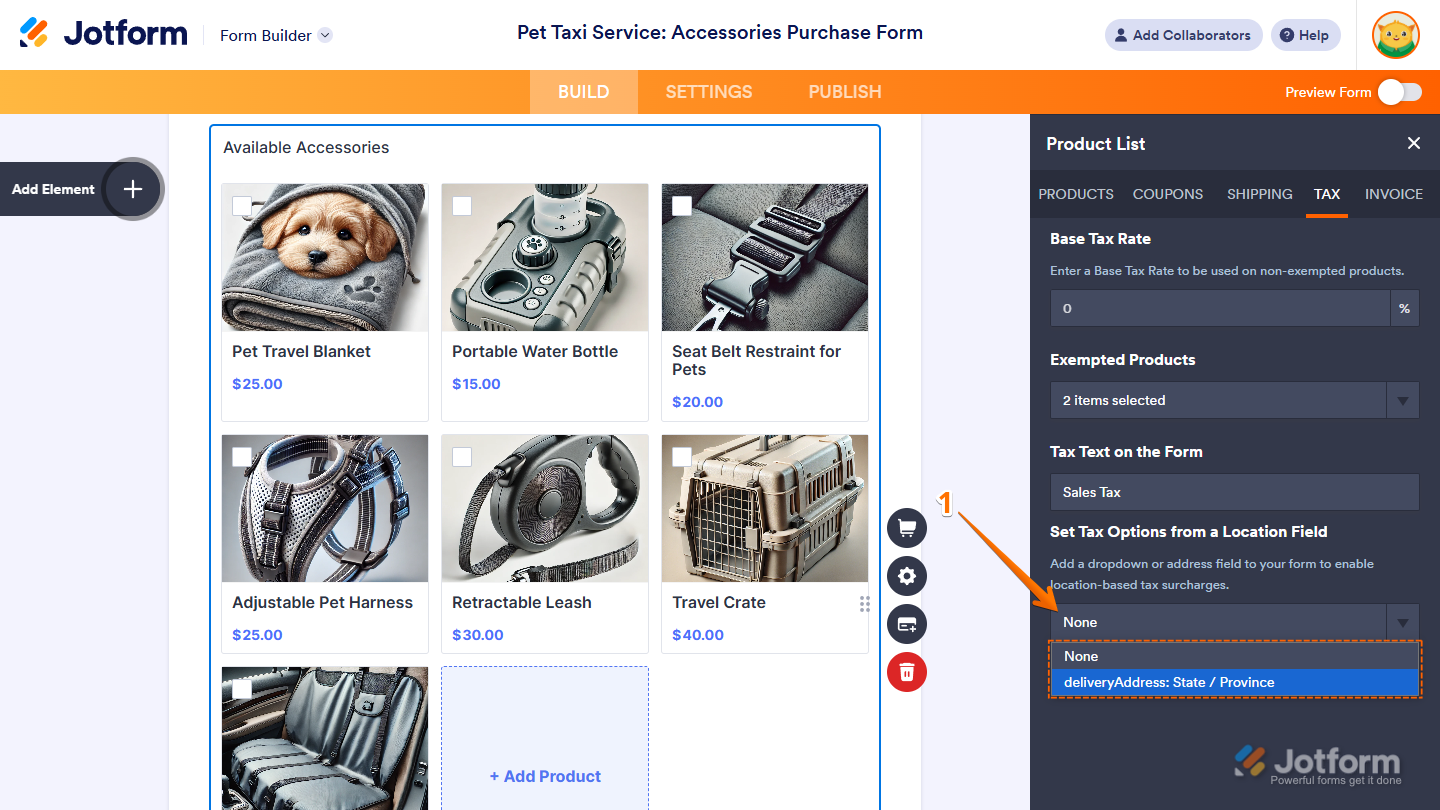 You can add location-based tax on top of your base rate by Adding and Setting Up an Address Field on your form. This lets you apply different tax rates depending on where your customer is located. Here’s how to do it: